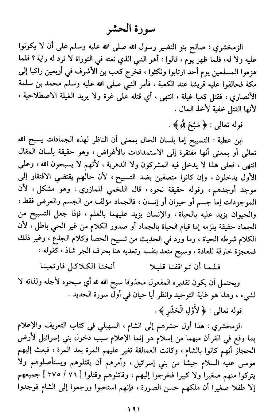 الزمخشري: هذا أول حشرهم إلى الشام، السهيلي في كتاب التعريف والإعلام بما وقع في القرآن مبهما من [أعلام*] هو إنما الإعلام سبب دخول بني إسرائيل لأرض الحجاز أنهم كانوا بالشام، وكانت العمالقة تغير عليهم المرة بعد المرة، فبعث إليهم موسى عليه السلام جيشا من بني إسرائيل، وأمرهم أن يقتلوهم ويستأصلوهم ولا يتركوا منهم صغيرا ولا كبيرا، فخرجوا إليهم، وقاتلوهم وقتلوا جميعهم إلا طفلا صغيرا [ابن*] ملكهم حَسَنَ الصورةِ، فإنهم [استحيوا*] ورجعوا إلى الشام فوجدوا