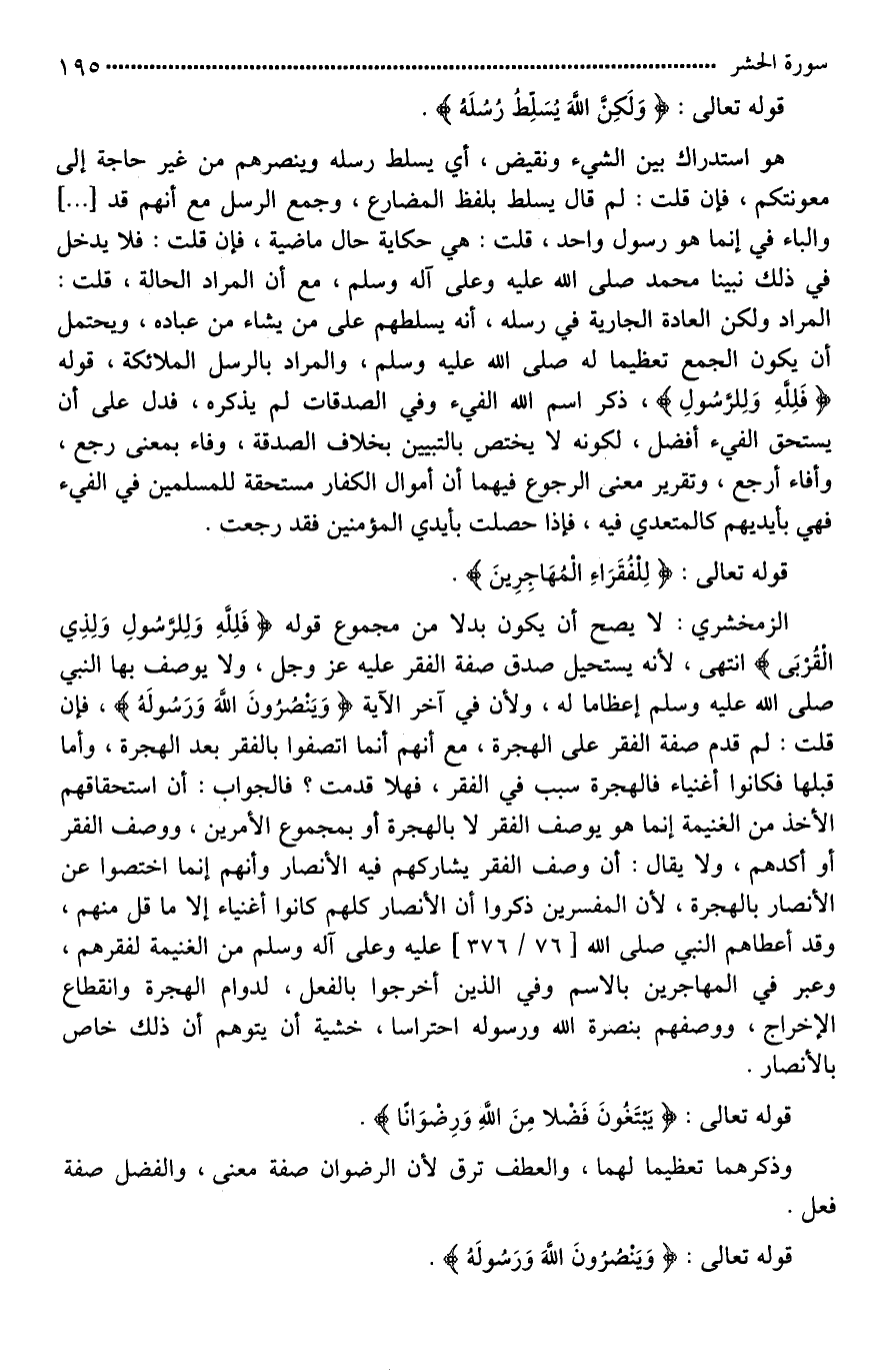 هو استدراك بين الشيء [ونقيضه*]، أي يسلط رسله وينصرهم من غير حاجة إلى معونتكم، فإِن قلت: لم قال (يُسَلِّطُ) بلفظ المضارع، وجمع الرسل مع أنهم قد [مضوا*] [والباقي*] إنما هو رسول واحد، قلت: هي حكاية حال ماضية، فإن قلت: فلا يدخل في ذلك نبينا محمد صلى الله عليه وعلى آله وسلم، مع أن المراد الحالة، قلت: المراد ولكن العادة الجارية في رسله، أنه يسلطهم على من يشاء من عباده، ويحتمل أن يكون الجمع تعظيما له صلى الله عليه وسلم، والمراد بالرسل الملائكة، قوله (فَلِلَّهِ وَلِلرَّسُولِ ... (7) .. ، ذكر اسم الله [في*] الفيء، وفي الصدقات لم يذكره، فدل على أن [مستحق*] الفيء أفضل، لكونه لَا يختص [**بالتبيين] بخلاف الصدقة، وفاءَ بمعنى رجع، وأفاء أرجع، وتقرير معنى الرجوع فيهما أن أموال الكفار مستحقة للمسلمين في الفيء فهي بأيديهم [**كالمتعدي فيه]، فإذا حصلت بأيدي المؤمنين فقد رجعت.