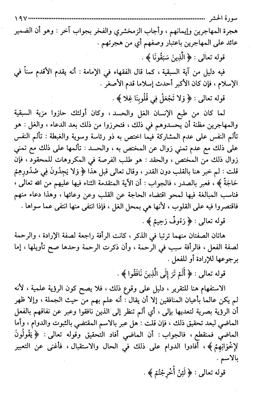 لما كان من طبع الإنسان الغل والحسد، وكان أولئك حازوا مزية السبقية، والمهاجرين مظنة أن يحسدوهم في ذلك، فتحرزوا من ذلك بعد الدعاء، والغل: هو تألم النفس على عدم المشاركة فيما اختص به ذو رئاسة وسوية، والغبطة: تألم النفس على ذلك، مع عدم تمني زوال [ذلك*] عن المختص به، والحسد: تألمها على ذلك، مع تمني زوال ذلك [عن*] المختص، والحقد: هو طلب [**الفرصة في المكروهات للمحقود]، فإن قلت: لم خبر هنا بالقلب دون [الصدر*]، وقال تعالى قبل هذا (وَلَا يَجِدُونَ فِي صُدُورِهِمْ حَاجَةً)، فعبر بالصدر؟ فالجواب: أن الآية المتقدمة الثناء فيها عليهم من الله تعالى، فناسب المبالغة فيها لمحو اقتضاء الحاجة عن القلب وعن [وعائه*]، وهذا دعاء منهم فاقتصروا فيه على القلوب، لأنها هي بمحل الغل، فإذا انتفى منها انتفى عما سواها.