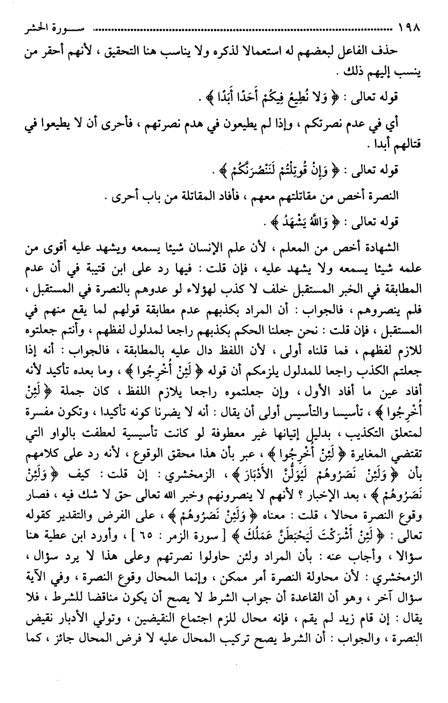 الشهادة أخص من [العلم*]، لأن علم الإنسان شيئا يسمعه ويشهد عليه أقوى من علمه شيئا يسمعه ولا يشهد عليه، فإِن قلت: فيها رد على ابن قتيبة في أن عدم المطابقة في الخبر المستقبل خلف لَا كذب لهؤلاء، [وعدوهم*] بالنصرة في المستقبل، فلم ينصروهم، فالجواب: أن المراد بكذبهم عدم مطابقة قولهم لما يقع منهم في المستقبل، فإِن قلت: نحن جعلنا الحكم بكذبهم راجعا لمدلول لفظهم، وأنتم جعلتوه للازم لفظهم، فما قلناه أولى، لأن اللفظ دال عليه بالمطابقة، فالجواب: أنه إذا جعلتم الكذب راجعا للمدلول يلزمكم أن قوله (لَئِنْ أُخْرِجُوا)، وما بعده تأكيد؛ لأنه أفاد عين ما أفاد الأول، وإن جعلتموه راجعا [بلازم اللفظ*]، كان جملة (لَئِنْ أُخْرِجُوا)، تأسيسا، والتأسيس أولى، [بأن يقال*]: إنه لَا يضرنا كونه تأكيدا، وتكون مفسرة لمتعلق التكذيب، بدليل إتيانها غير معطوفة لو كانت تأسيسية؛ لعطفت بالواو التي تقتضي المغايرة (لَئِنْ أُخْرِجُوا ... (12) .. ، عبر بأن هذا محقق الوقوع، لأنه رد على كلامهم بأن (وَلَئِن نَصَرُوهُم لَيُوَلُّنَّ الأَدْبَارَ)، الزمخشري: إن قلت: كيف (وَلَئِنْ نَصَرُوهُمْ)، بعد الإخبار؛ لأنهم لَا ينصرونهم، وخبر الله تعالى حق لَا شك فيه، فصار وقوع النصرة محالا، قلت: معناه (وَلَئِنْ نَصَرُوهُم)، على الفرض والتقدير كقوله تعالى: (لَئِنْ أَشْرَكْتَ لَيَحْبَطَنَّ عَمَلُكَ)، وأورد ابن عطية هنا سؤالا، وأجاب عنه: بأن المراد ولئن حاولوا نصرتهم وعلى هذا لَا يرد سؤال، الزمخشري: لأن محاولة النصرة أمر ممكن، وإنما المحال وقوع النصرة، وفي الآية سؤال آخر، وهو أن القاعدة أن جواب الشرط لَا يصح أن يكون مناقضا للشرط، فلا يقال: إن قام زيد لم يقم، فإِنه محال [للزوم*] اجتماع النقيضين، وتولي الأدبار نقيض النصرة، والجواب: أن الشرط يصح تركيب المحال عليه؛ لَا فرض المحال جائز، كما