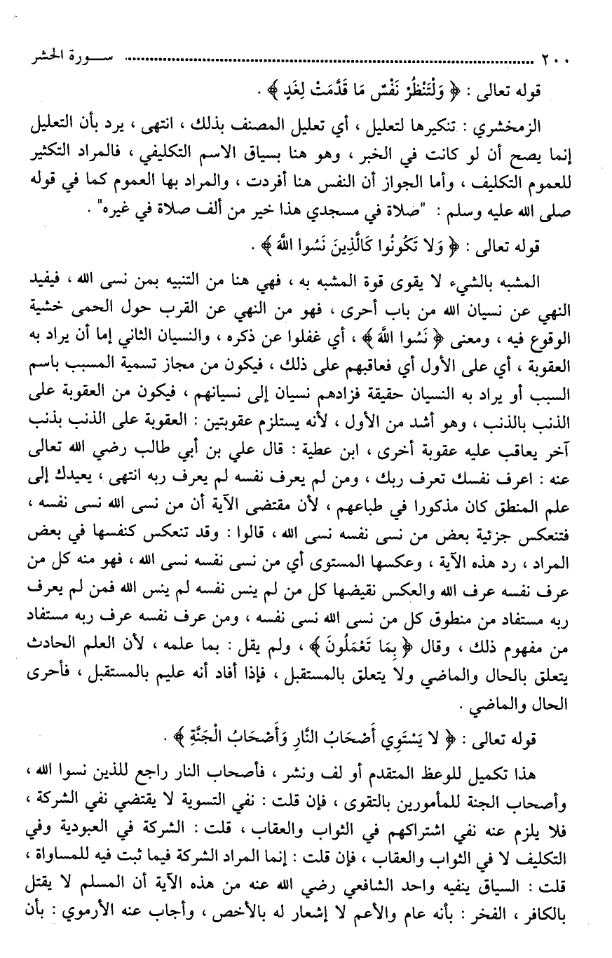 المشبه بالشيء لَا يقوى قوة المشبه به، فهي هنا من [التشبيه*] بمن نسي الله، فيفيد النهي عن نسيان الله من باب أحرى، فهو من النهي عن القرب حول الحمى خشية الوقوع فيه، ومعنى (نَسُوا اللَّهَ)، أي غفلوا عن ذكره، والنسيان الثاني إما أن يراد به العقوبة، أي على الأول أي فعاقبهم على ذلك، فيكون من مجاز تسمية المسبب باسم السبب، أو يراد به النسيان حقيقة فزادهم [نسيانا*] إلى نسيانهم، فيكون من العقوبة على الذنب بالذنب، وهو أشد من الأول، لأنه يستلزم عقوبتين: العقوبة على الذنب بذنب آخر يعاقب عليه عقوبة أخرى، ابن عطية: قال علي بن أبي طالب رضي الله تعالى عنه؛ اعرف نفسك تعرف ربك، ومن لم يعرف نفسه لم يعرف ربه انتهى، يعيدك إلى علم المنطق كان مذكورا في طباعهم، لأن مقتضى الآية أن من نسي الله نسي نفسه، فتنعكس جزئية بعض من نسي نفسه نسي الله، قالوا: وقد تنعكس كنفسها في بعض المراد، رد هذه الآية، وعكسها المستوى أي من نسي نفسه نسي الله، فهو منه كل من عرف نفسه عرف الله، والعكس نقيضها كل من لم ينس نفسه لم ينس الله فمن لم يعرف ربه مستفاد من منطوق كل من نسي الله نسي نفسه، ومن عرف نفسه عرف ربه مستفاد من مفهوم ذلك، وقال (بِمَا تَعْمَلُونَ)، ولم يقل: بما علمه، لأن العلم الحادث يتعلق بالحال والماضي، ولا يتعلق بالمستقبل، فإذا أفاد أنه عليم بالمستقبل، فأحرى الحال والماضي.