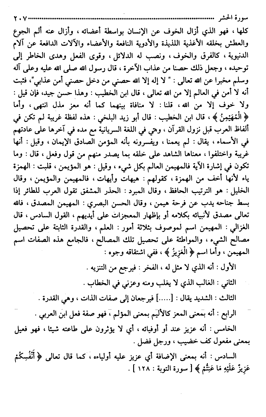 كلها، [هو*] الذي أزال الخوف عن الإنسان بواسطة أعضائه، وأزال عنه ألم الجوع والعطش بخلقه الأغذية اللذيذة والأدوية النافعة والأعضاء والآلات الدافعة [عنه الآلام*] الدنيوية، كالفرق والخوف، ونصب له الدلائل، وقوى الفعل وهدى الخاطر إلى توحيده، وجعل ذلك حصنا من عذاب الآخرة، قال رسول الله صلى الله عليه وعلى آله وسلم مخبرا عن الله تعالى: "لَا إله إلا الله حصني من دخل حصني أمن عذابي"، فثبت أنه لَا أمن في العالم إلا من الله تعالى، قال ابن الخطيب: وهذا حسن جيد، فإِن قيل: ولا خوف إلا من الله، قلنا: لَا منافاة بينهما كما أنه معز مذل انتهى، وأما (الْمُهَيمِنُ)، قال ابن الخطيب: قال أبو زيد البلخي: هذه لفظة غريبة لم تكن في ألفاظ العرب قبل نزول القرآن، وهي في اللغة السريانية مع مده في آخرها على عادتهم في الأسماء، يقال: [**لم يعمنا]، ويفسرونه بأنه المؤمن الصادق الإيمان، وقيل: إنها غريبة واختلفوا، معناها الشاهد على خلقه بما يصدر منهم من قول وفعل، قال: وما تكون في إشارة الآية فالمهيمن العالم بكل شيء، وقيل: هو المؤيمن، قلبت: الهمزة ياء لأنها أخف من الهمزة، كقولهم: هيهات وأيهات، فالمهيمن والمؤيمن، وقال الخليل: هو الترتيب الحافظ، وقال المبرد: الحذر المشفق تقول العرب للطائر إذا بسط جناحه يدب عن فرحة هيمن، وقال الحسن البصري: المهيمن المصدق، فالله تعالى مصدق لأنبيائه بكلامه أو بإظهار المعجزات على أيديهم، القول السادس، قال الغزالي: المهيمن اسم لموصوف بثلاثة أمور: العلم، والقدرة الثابتة على تحصيل مصالح الشيء، والمواطئة على تحصيل تلك المصالح، فالجامع هنه الصفات اسم المهيمن، وأما اسم (الْعَزِيزُ)، ففي اشتقاقه وجوه: