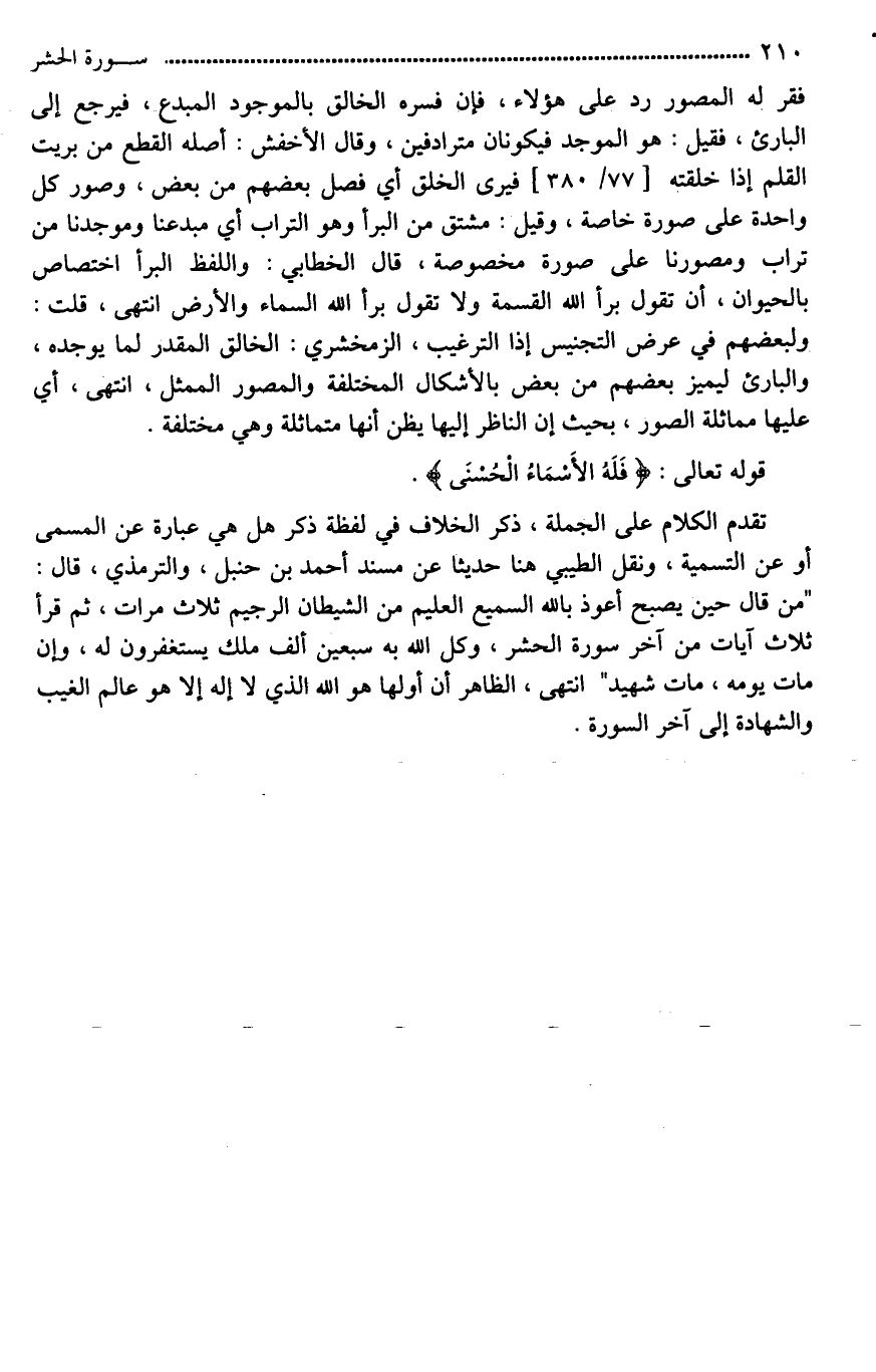 تقدم الكلام على الجملة، ذكر الخلاف في لفظة ذكر هل هي عبارة عن المسمى أو عن التسمية، ونقل الطيبي هنا حديثا عن مسند أحمد بن حنبل، والترمذي، قال: ""مَنْ قَالَ حِينَ يُصْبِحُ ثَلَاثَ مَرَّاتٍ: أَعُوذُ بِاللهِ السَّمِيعِ الْعَلِيمِ مِنَ الشَّيْطَانِ الرَّجِيمِ، ثُمَّ قَرَأَ الثَّلَاثَ آيَاتٍ مِنْ آخِرِ سُورَةِ الْحَشْرِ، وَكَّلَ اللهُ بِهِ سَبْعِينَ أَلْفَ مَلَكٍ يُصَلُّونَ عَلَيْهِ حَتَّى يُمْسِيَ، إِنْ مَاتَ فِي ذَلِكَ الْيَوْمِ مَاتَ شَهِيدًا،" انتهى. الظاهر أن أولها (هُوَ اللَّهُ الَّذِي لَا إِلَهَ إِلَّا هُوَ عَالِمُ الْغَيْبِ وَالشَّهَادَةِ) إلى آخر السورة.