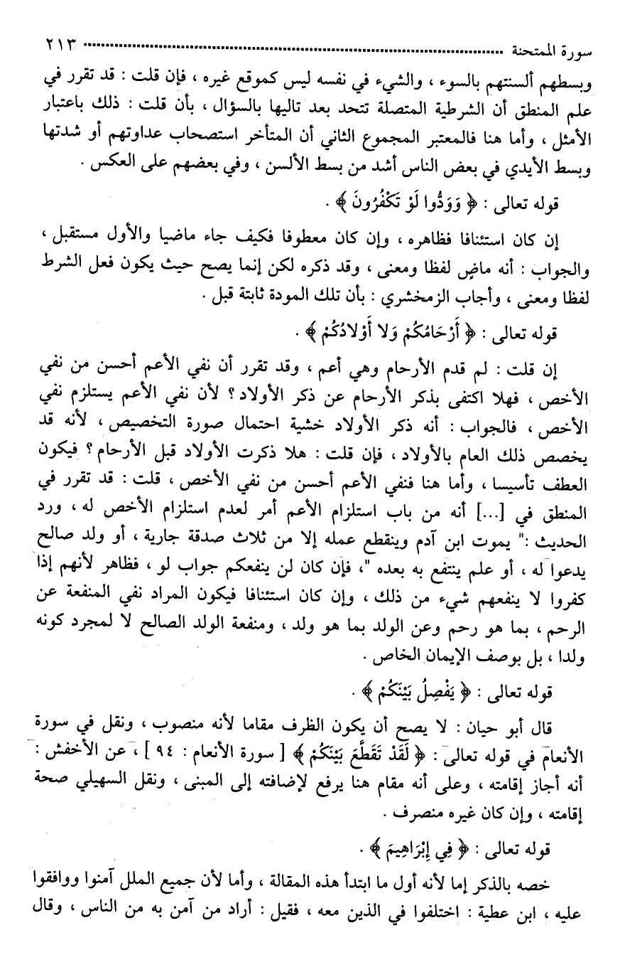 إن قلت: لم قدم الأرحام وهي أعم، وقد تقرر أن نفي الأعم أحسن من نفي الأخص، فهلا اكتفى بذكر الأرحام عن ذكر الأولاد؛ لأن نفي الأعم يستلزم نفي الأخص؟ فالجواب: أنه ذكر الأولاد خشية احتمال صورة التخصيص، لأنه قد يخصص ذلك العام بالأولاد، فإِن قلت: هلا ذكرت الأولاد قبل الأرحام؟ فيكون العطف تأسيسا، وأما هنا فنفي الأعم [أخص*] من نفي الأخص، قلت: قد تقرر في [علم*] المنطق في [العُكُوسات أن هذا] من باب استلزام الأعم [أمرا*] لعدم استلزام الأخص له، ورد الحديث: " ["إِذَا مَاتَ الْإِنْسَانُ انْقَطَعَ عَنْهُ عَمَلُهُ إِلَّا مِنْ ثَلَاثَةٍ: إِلَّا مِنْ صَدَقَةٍ جَارِيَةٍ، أَوْ عِلْمٍ يُنْتَفَعُ بِهِ، أَوْ وَلَدٍ صَالِحٍ يَدْعُو لَهُ*] "، فإن كان (لن [تنفعكم) *] جواب (لو)، فظاهر لأنهم إذا كفروا لَا ينفعهم شيء من ذلك، وإن كان استئنافا؛ فيكون المراد نفي المنفعة عن الرحم، بما هو رحم، وعن الولد بما هو ولد، ومنفعة الولد الصالح لَا لمجرد كونه ولدا، بل بوصف الإيمان الخاص.