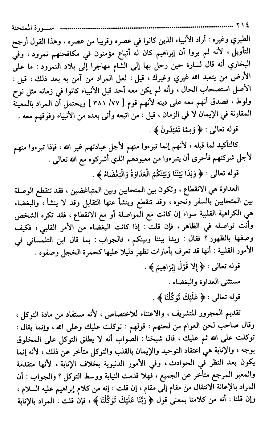 تقديم المجرور للتشريف، والاعتناء للاختصاص، لأنه مستفاد من مادة التوكل، وقال صاحب لحن العوام: من لحنهم: قولهم: توكلت عليك وعلى الله، وإنما يقال: توكلت على الله ثم عليك، قال شيخنا: الصواب أنه لَا يطلق التوكل على المخلوق بوجه، والإنابة هي اعتقاد التوحيد والإيمان بالقلب والتوكل متأخر عن ذلك، لأنه إنما يكون بعد النظر في الحوادث، وفي الأمور الدنيوية بخلاف الإنابة، لأنها متقدمة و [الْمَصِيرُ*] المرجع متأخر عن الجميع، فهلا قدمت النيابة ووسط التوكل؟ والجواب: أن المراد [بالإنانة*] الانتقال من مقام إلى مقام، إن قلت: إنه من كلام إبراهيم عليه السلام، وإن قلنا: إنه من كلامنا بمعنى [نقول*] (رَبَّنَا عَلَيْكَ تَوَكَّلْنَا)، فإِن قلت: المراد بالإنابة