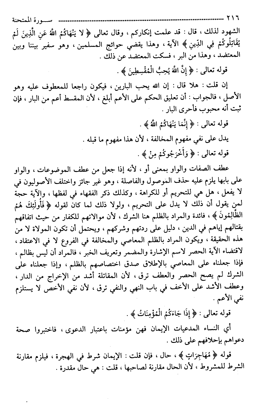 عطف الصفات والواو بمعنى أو، لأنه إذا جعل من عطف الموضوعات، والواو على بابها يلزم عليه حذف الموصول والفاصلة، وهو غير جائز، واختلف الأصوليون في [لا تفعل*]، هل هي للتحريم أو للكراهة، وكذلك ذكر الفقهاء في لفظها، والآية حجة لمن يقول إن ذلك لَا يدل على التحريم، ولولا ذلك لما كان لقوله (فَأُولَئِكَ هُمُ الظَّالِمُونَ)، فائدة، والمراد بالظلم هنا الشرك، لأن موالاتهم للكفار من حيث اتفاقهم بقتالهم إياهم في الدين، دليل على ردتهم وشركهم، ويحتمل أن تكون الموالاة لَا من هذه الحقيقة، ويكون المراد بالظلم المعاصي والمخالفة في الفروع لَا في الاعتقاد، لاقتضاء الآية الحصر لاسم الإشارة والمضمر وتعريف الخبر، فالمراد أن ليس بظالم، فإِذا [حملناه*] على المعاصي بالإطلاق صدق اختصاصهم بالظلم، وإذا [حملناه*] على الشرك لم يصح الحصر والعطف ترق، لأن المقاتلة أشد من الإخراج من الدار، وعطف الأشد على الأخف في باب النهي والنفي ترق، لأن نفي الأخص لَا يستلزم نفي الأعم.
