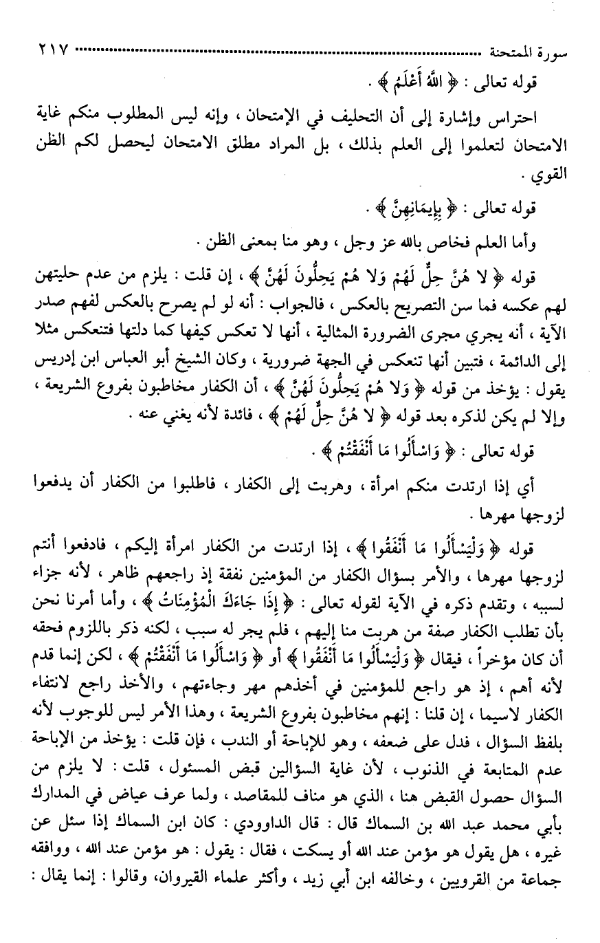 قوله (وَلْيَسْأَلُوا مَا أَنْفَقُوا)، إذا ارتدت من الكفار امرأة إليكم، فادفعوا أنتم لزوجها مهرها، والأمر بسؤال الكفار من المؤمنين نفقة إذ راجعهم ظاهر، لأنه جزاء لسببه، وتقدم ذكره في الآية لقوله تعالى: (إِذَا جَاءَكَ الْمُؤْمِنَاتُ)، وأما أمرنا نحن بأن [نطلب*] الكفار صفة من هربت منا إليهم، فلم يجر له سبب، لكنه ذكر باللزوم فحقه أن [يكون*] مؤخراً، فيقال (وَلْيَسْأَلُوا مَا أَنْفَقُوا) أو (وَاسْأَلُوا مَا أَنْفَقْتُمْ)، لكن إنما قدم لأنه أهم، إذ هو راجع للمؤمنين في أخذهم [مهر من جاءتهم*]، والأخذ راجع لانتفاء الكفار لاسيما، إن قلنا: إنهم مخاطبون بفروع الشريعة، وهذا الأمر ليس للوجوب لأنه بلفظ السؤال، فدل على ضعفه، وهو للإباحة أو الندب، فإن قلت: يؤخذ من الإباحة عدم المتابعة في الذنوب، لأن غاية السؤالين قبض المسئول، قلت: لَا يلزم من السؤال حصول القبض هنا، الذي هو مناف للمقاصد، ولما عرف عياض في المدارك بأبي محمد عبد الله بن السماك قال: قال الداوودي: كان ابن السماك إذا سئل عن غيره، هل يقول هو مؤمن عند الله أو يسكت، فقال: يقول: هو مؤمن عند الله، ووافقه جماعة من القرويين، وخالفه ابن أبي زيد، وأكثر علماء القيروان، وقالوا: إنما يقال: