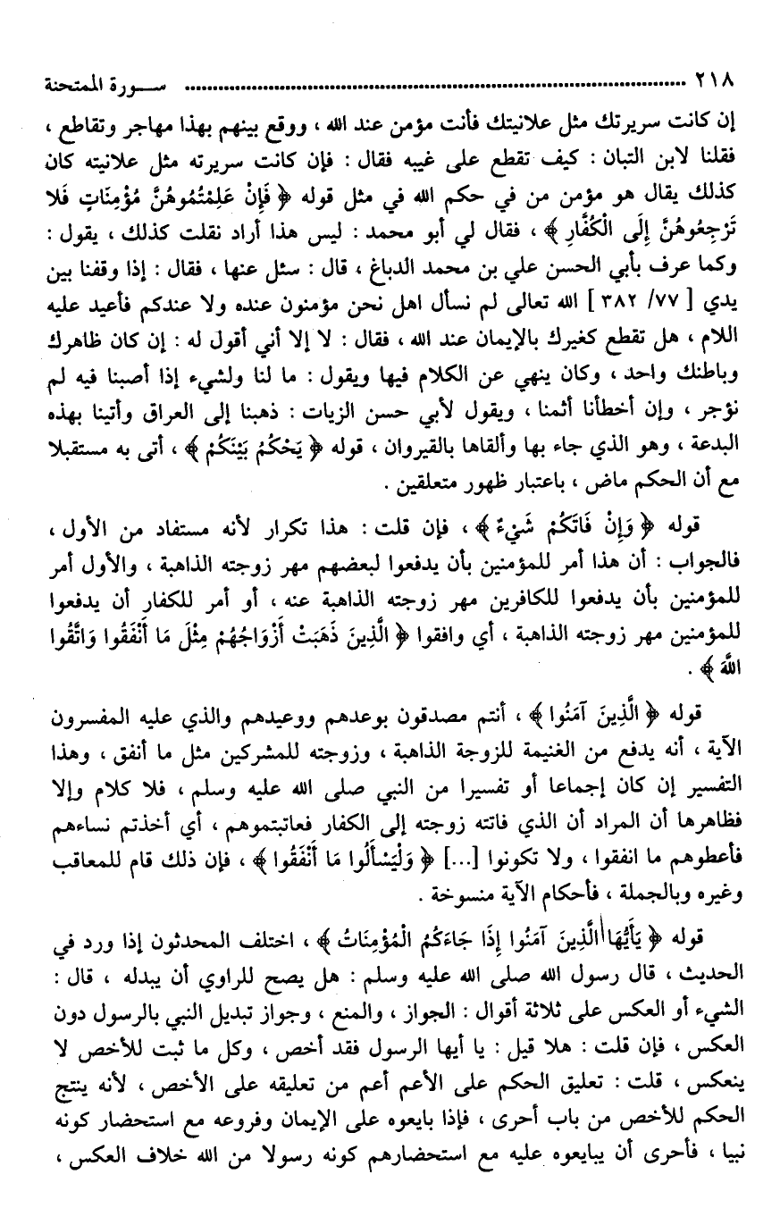 إن كانت سريرتك مثل علانيتك فأنت مؤمن عند الله، ووقع بينهم بهذا مهاجر وتقاطع، فقلنا لابن التبان: كيف تقطع على غيبه فقال: فإِن كانت سريرته مثل علانيته كان كذلك يقال هو مؤمن من في حكم الله في مثل قوله (فَإِنْ عَلِمْتُمُوهُنَّ مُؤْمِنَاتٍ فَلَا تَرْجِعُوهُنَّ إِلَى الْكُفَّارِ)، فقال لي أبو محمد: ليس هذا أراد [فقلت*] كذلك، يقول: [ولما*] عرف بأبي الحسن علي بن محمد الدباغ، قال: سئل عنها، فقال: إذا وقفنا بين يدي الله تعالى لم نسأل [هل*] نحن مؤمنون عنده ولا عندكم؛ فأعيد عليه [الكلام*]، هل تقطع كغيرك بالإيمان عند الله، فقال: لَا إلا أني أقول له: إن كان ظاهرك وباطنك واحد، وكان ينهي عن الكلام فيها، ويقول: ما لنا ولشيء إذا أصبنا فيه لم نؤجر، وإن أخطأنا أثمنا، ويقول لأبي حسن الزيات: ذهبنا إلى العراق وأتينا بهذه البدعة، وهو الذي جاء بها وألقاها بالقيروان، قوله (يَحْكُمُ بَيْنَكُمْ)، أتى به مستقبلا مع أن الحكم ماض، باعتبار ظهور متعلقين.