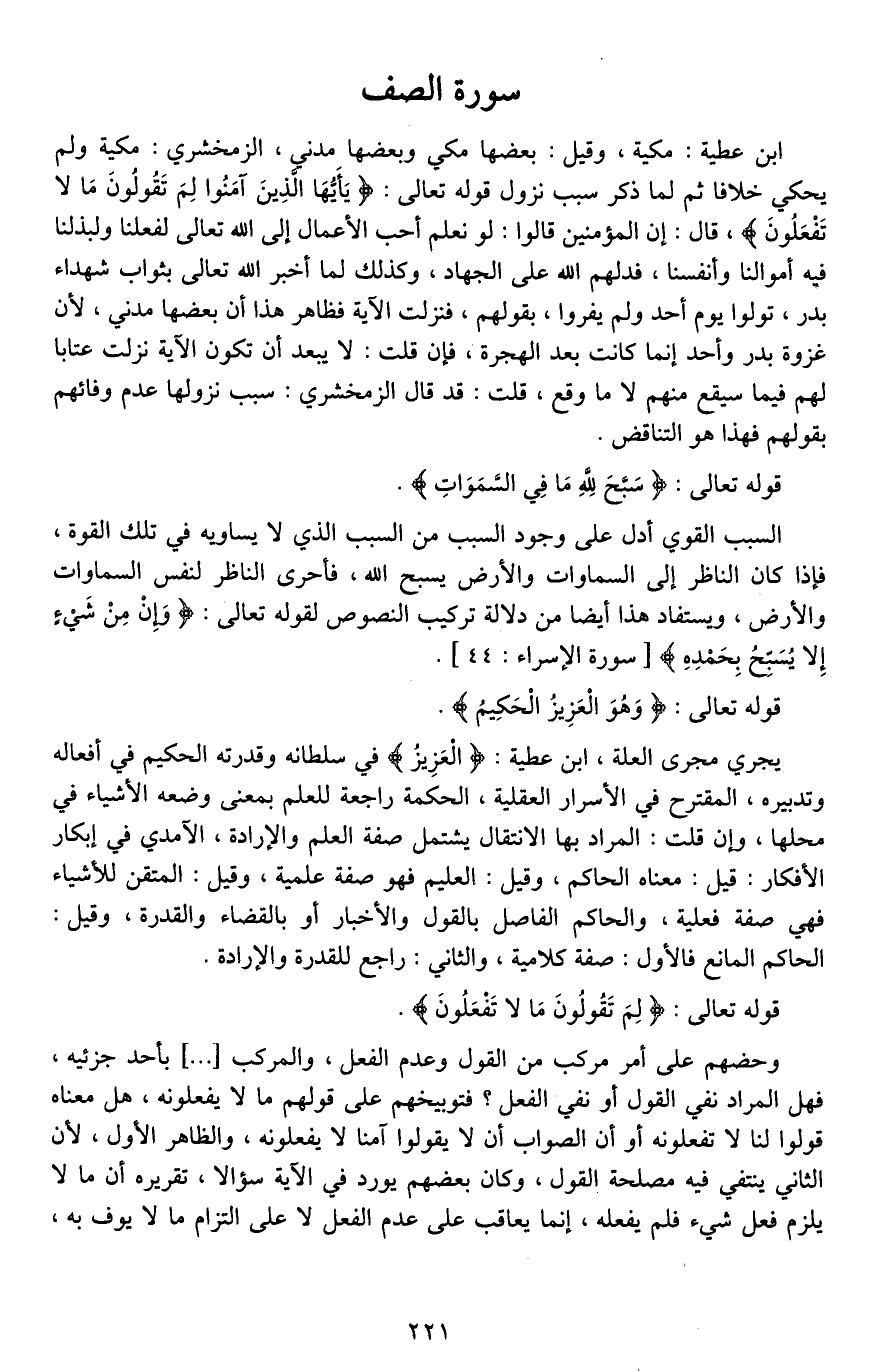 ابن عطية: مكية، وقيل: بعضها مكي وبعضها مدني، الزمخشري: مكية ولم يحكي خلافا، ثم لما ذكر سبب نزول قوله تعالى: (يَا أَيُّهَا الذِينَ آمَنُوا لِمَ تَقُولُونَ مَا لاَ تَفْعَلُونَ)، قال: إن المؤمنين قالوا: لو نعلم أحب الأعمال إلى الله تعالى [لعملناه*] ولبذلنا فيه أموالنا وأنفسنا، فدلهم الله على الجهاد، [فولوا يوم أحد فعيرهم*]، [وقيل*] لما أخبر الله تعالى بثواب شهداء بدر، [قالوا: لئن لقينا قتالا لنفرغن فيه وسعنا، ففروا يوم أحد ولم يفوا*] (¬1)، بقولهم، فنزلت الآية فظاهر هذا أن بعضها مدني، لأن غزوة بدر وأُحد إنما كانت بعد الهجرة، فإن قلت: لَا يبعد أن تكون الآية نزلت عتابا لهم فيما سيقع منهم لَا ما وقع، قلت: قد قال الزمخشري: سبب نزولها عدم وفائهم بقولهم فهذا هو التناقض.