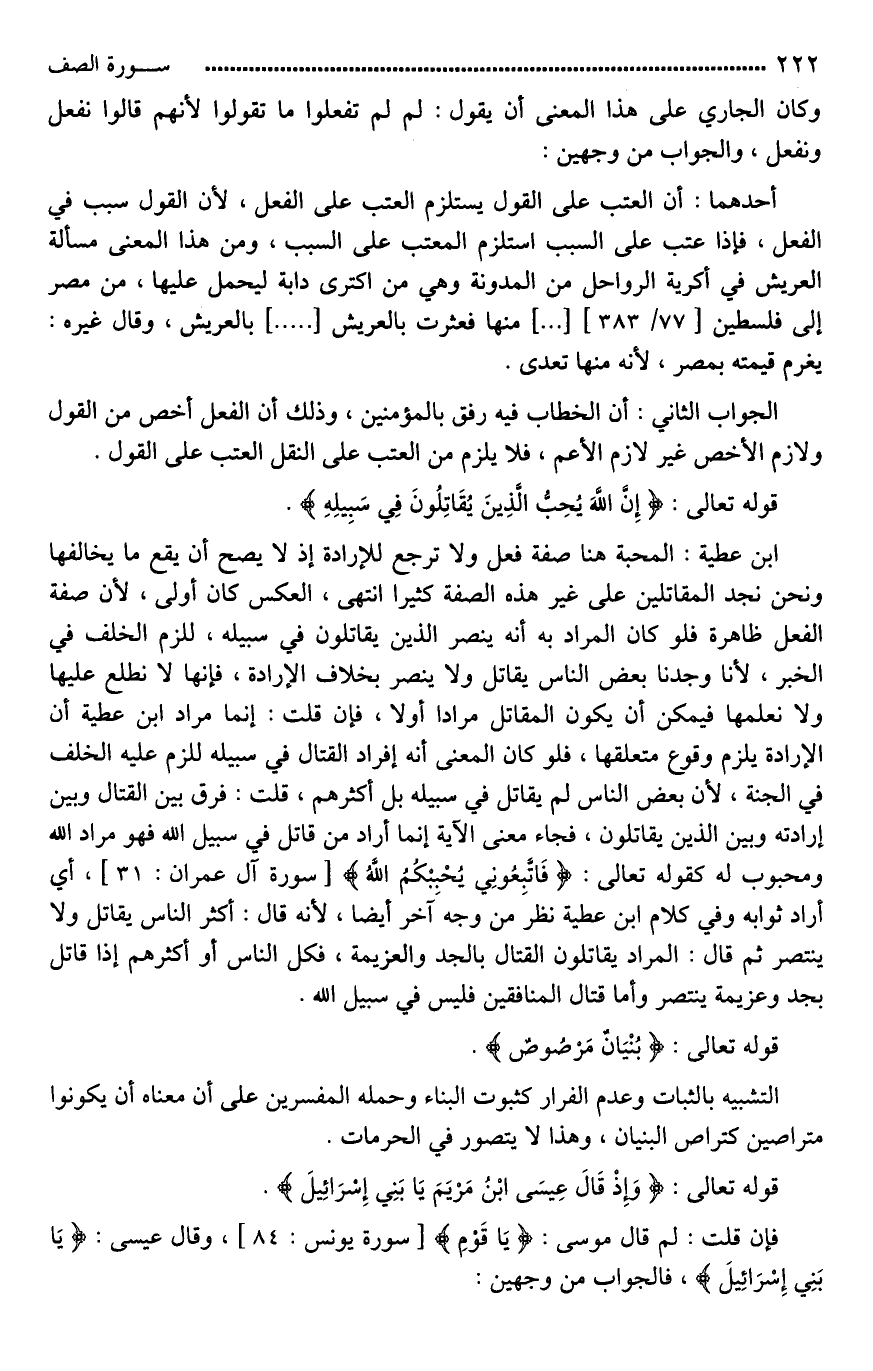 ابن عطية: المحبة هنا صفة فعل، ولا ترجع للإرادة؛ إذ لَا يصح أن يقع ما يخالفها، ونحن نجد المقاتلين على غير هذه الصفة كثيرا انتهى، العكس كان أولى، لأن صفة الفعل ظاهرة فلو كان المراد به أنه ينصر الذين يقاتلون في سبيله، للزم الخلف في الخبر، لأنا وجدنا بعض النَّاس يقاتل ولا ينصر بخلاف الإرادة، [فإنا*] لَا نطلع عليها ولا نعلمها، فيمكن أن يكون المقاتل مرادا أولا، فإن قلت: إنما مراد ابن عطية أن الإرادة يلزم وقوع متعلقها، فلو كان المعنى أنه إفراد القتال في سبيله للزم عليه الخلف في الجنة، لأن بعض النَّاس لم يقاتل في سبيله بل أكثرهم، قلت: فرق بين القتال وبين إرادته وبين الذين يقاتلون، فجاء معنى الآية إنما أراد من قاتل في سبيل الله فهو مراد الله ومحبوب له كقوله تعالى: (فَاتَّبِعُونِي يُحْبِبْكُمُ اللَّهُ)، أي أراد ثوابه، وفي كلام ابن عطية نظر من وجه آخر أيضا، لأنه قال: أكثر النَّاس يقاتل ولا ينتصر، ثم قال: المراد يقاتلون القتال بالجد والعزيمة، فكل النَّاس أو أكثرهم إذا قاتل بجد وعزيمة ينتصر، وأما قتال المنافقين فليس في سبيل الله.