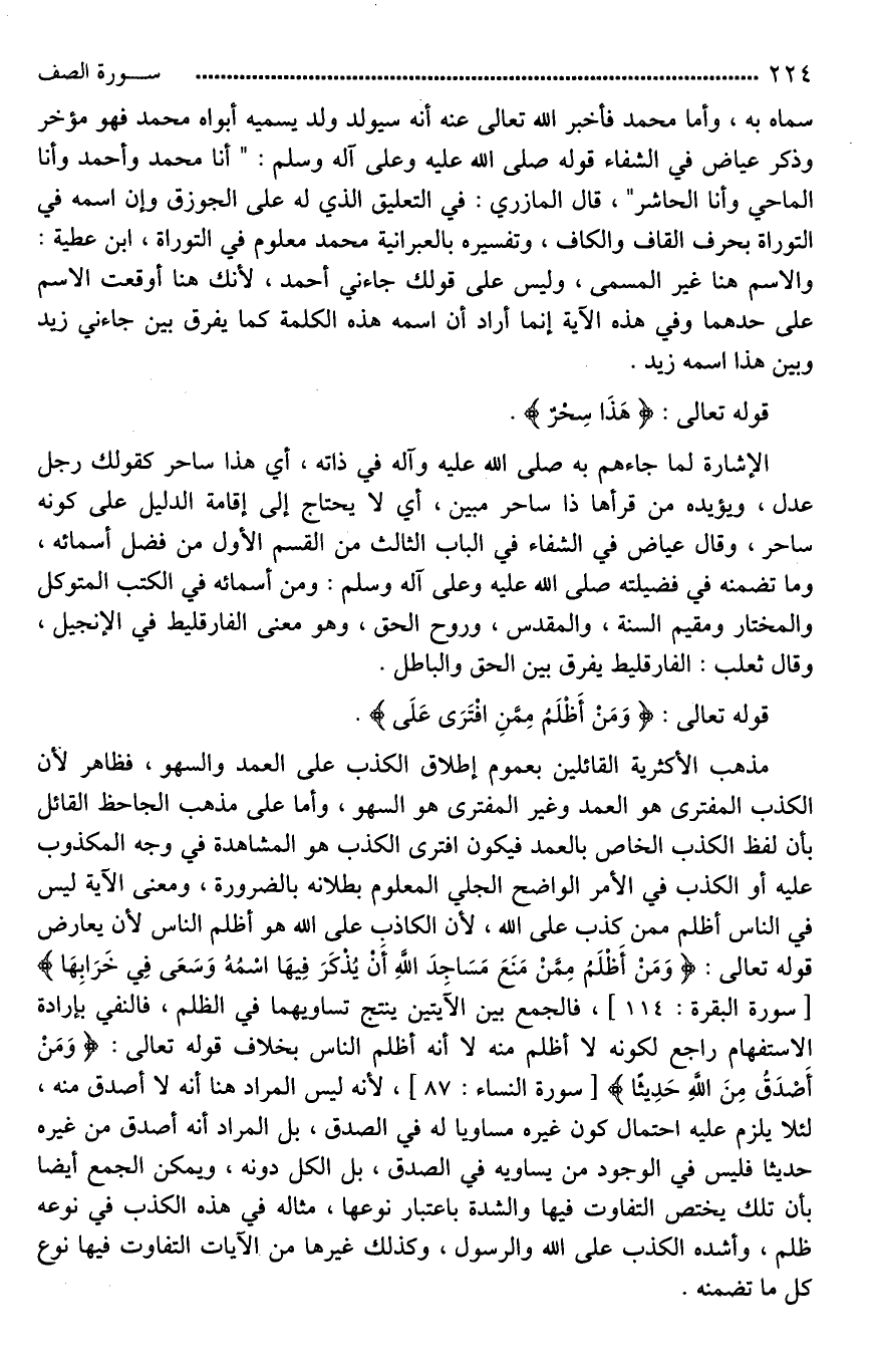 مذهب الأكثرية القائلين بعموم إطلاق الكذب على العمد والسهو، [ظاهر*] لأن الكذب المفترى هو العمد وغير المفترى هو السهو، وأما على مذهب الجاحظ القائل بأن لفظ الكذب الخاص بالعمد، فيكون افترى الكذب هو المشاهدة في وجه المكذوب عليه، أو الكذب في الأمر الواضح الجلي المعلوم بطلانه بالضرورة، ومعنى الآية ليس في النَّاس أظلم ممن كذب على الله، لأن الكاذب على الله هو أظلم النَّاس [ولا*] يعارض قوله تعالى: (وَمَنْ أَظْلَمُ مِمَّنْ مَنَعَ مَسَاجِدَ اللَّهِ أَنْ يُذْكَرَ فِيهَا اسْمُهُ وَسَعَى فِي خَرَابِهَا)، فالجمع بين الآيتين ينتج تساويهما في الظلم، فالنفي بإرادة الاستفهام راجع لكونه لَا أظلم منه لَا أنه أظلم النَّاس؛ بخلاف قوله تعالى: (وَمَنْ أَصْدَقُ مِنَ اللَّهِ حَدِيثًا)، لأنه ليس المراد هنا أنه لَا أصدق منه، لئلا يلزم عليه احتمال كون غيره مساويا له في الصدق، بل المراد أنه أصدق من غيره حديثا، فليس في الوجود من يساويه في الصدق، بل الكل دونه، ويمكن الجمع أيضا بأن تلك يختص التفاوت فيها والشدة باعتبار نوعها، مثاله في هذه، الكذب في نوعه ظلم، وأشده الكذب على الله والرسول، وكذلك غيرها من الآيات التفاوت فيها نوع كل ما تضمنه.