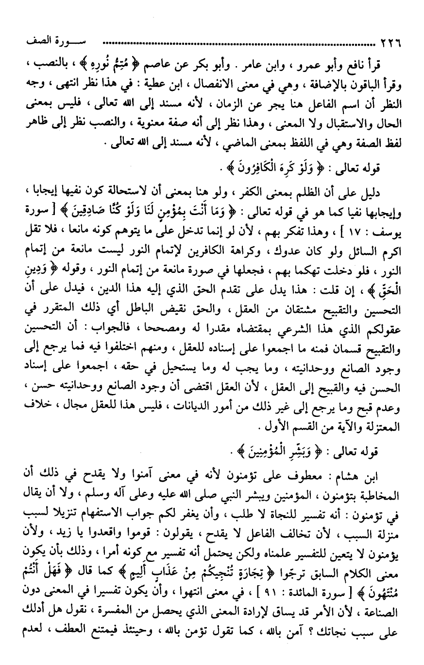 دليل على أن الظلم بمعنى الكفر، و (لو) هنا بمعنى (أن) لاستحالة كون نفيها إيجابا، وإيجابها نفيا؛ كما هو في قوله تعالى: (وَمَا أَنْتَ بِمُؤْمِنٍ لَنَا وَلَوْ كُنَّا صَادِقِينَ)، وهذا [تهكم بهم*]، لأن لو إنما تدخل على ما يتوهم كونه مانعا، فلا تقل أكرم السائل ولو كان عدوك، وكراهة الكافرين لإتمام النور ليست مانعة من إتمام النور، فلو دخلت تهكما بهم، فجعلها في صورة مانعة من إتمام النور، وقوله (وَدِينِ الْحَقِّ)، إن قلت: هذا يدل على تقدم الحق الذي إليه هذا الدين، فيدل على أن التحسين والتقبيح مشتقان من العقل، والحق نقيض الباطل، أي ذلك المتقرر في عقولكم الذي هذا الشرعي بمقتضاه مقدرا له ومصححا؟ فالجواب: أن التحسين والتقبيح قسمان، فمنه ما أجمعوا على إسناده للعقل، ومنهم اختلفوا فيه، فما يرجع إلى وجود الصانع ووحدانيته، وما يجب له وما يستحيل في حقه، أجمعوا على إسناد الحسن فيه والقبيح إلى العقل، لأن العقل اقتضى أن وجود الصانع ووحدانيته حسن، [وعدمه*] قبح، وما يرجع إلى غير ذلك من أمور الديانات، فليس [فيه*] للعقل مجال، [خلافا*] المعتزلة، والآية من القسم الأول.