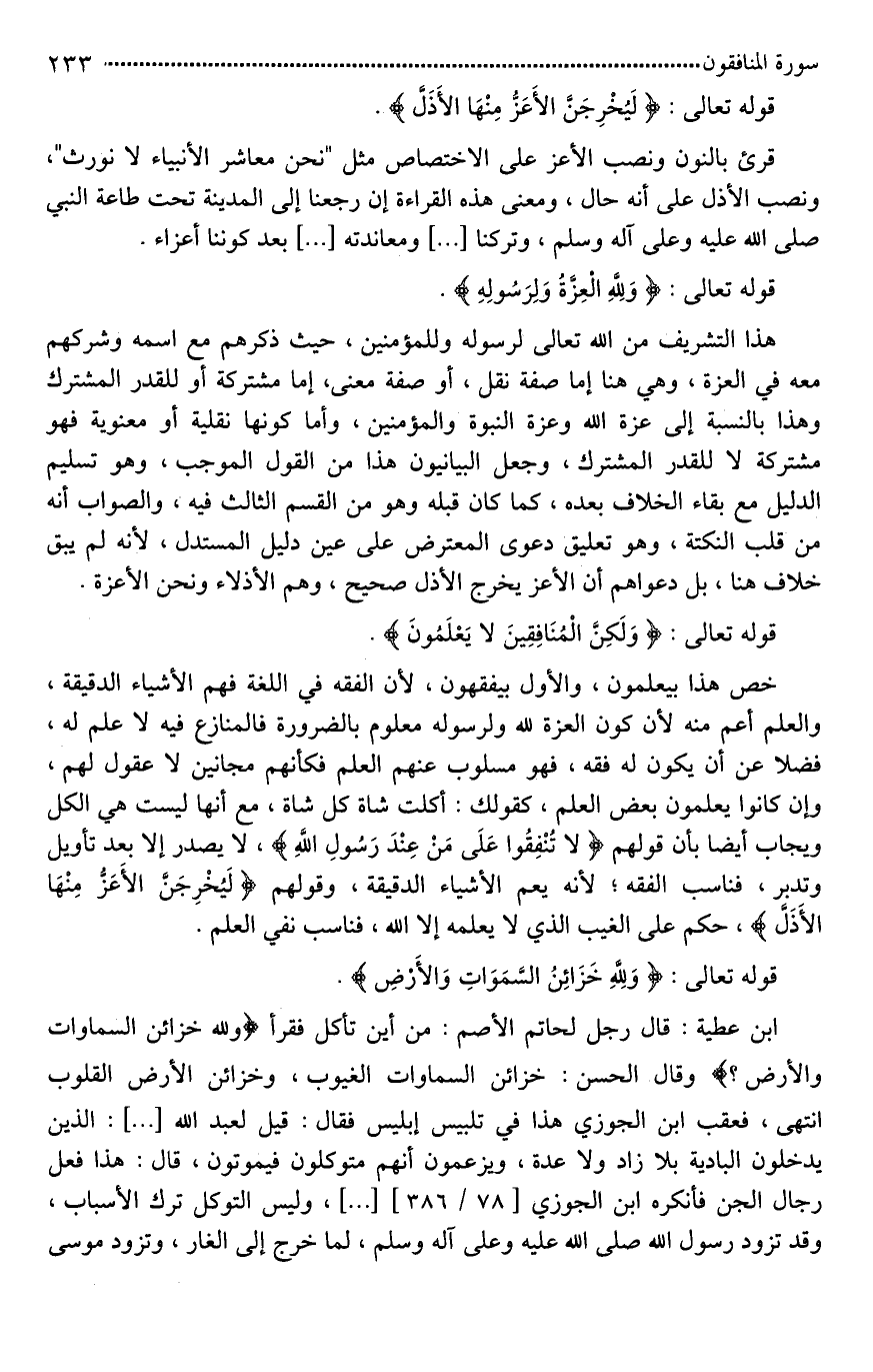 هذا التشريف من الله تعالى لرسوله وللمؤمنين، حيث ذكرهم مع اسمه وشركهم معه في العزة، وهي هنا إما صفة نقل، أو صفة معنى، إما مشتركة أو للقدر المشترك، وهذا بالنسبة إلى عزة الله وعزة النبوة والمؤمنين، وأما كونها نقلية أو معنوية فهو مشتركة لَا للقدر المشترك، وجعل البيانيون هذا من القول الموجب، وهو تسليم الدليل مع بقاء الخلاف بعده، كما كان قبله وهو من القسم الثالث فيه، والصواب أنه من قلب النكتة، وهو تعليق دعوى المعترض على عين دليل المستدل، لأنه لم يبق خلاف هنا، بل دعواهم أن الأعز يخرج الأذل صحيح، وهم الأذلاء ونحن الأعزة.