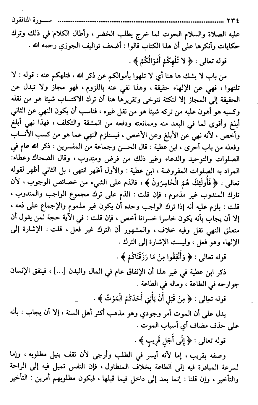 من باب [لَا أرينك ها هنا*] أي لَا تلهوا بأموالكم عن ذكر الله، فتلهكم عنه، قوله: لا تلتهوا، فهي عن الإلهاء حقيقة، وهذا نفي عنه باللزوم، فهو مجاز، ولا تبدل عن الحقيقة إلى المجاز إلا لنكتة تتوخى، وتقريرها هنا إن ترك الاكتساب شيئا هو من نقله وكسبه هو أهون عليه من تركه شيئا هو من نقل غيره، فناسب أن يكون النهي عن الثاني أبلغ وأقوى لما في البعد منه وممانعته ودفعه من المشقة والتكلف، فهذا نهي أبلغ وأخص، لأنه نهي عن الأبلغ وعن الأخص، فيستلزم النهي عما هو من كسب الأنساب وفعله من باب أحرى، ابن عطية: قال الحسن وجماعة من المفسرين: ذكر الله عام في الصلوات والتوحيد والدعاء وغير ذلك من فرض ومندوب، وقال الضحاك وعطاء: المراد به الصلوات المفروضة، ابن عطية: والأول أظهر انتهى، بل الثاني أظهر لقوله تعالى: (فَأُولَئِكَ هُمُ الْخَاسِرُونَ)، فالذم على الشيء من خصائص الوجوب، لأن تارك المندوب غير مذموم، فإِن قلت: الذم على ترك مجموع الواجب والمندوب؟ قلت: يلزم عليه أنه إذا ترك الواجب وحده أن يكون غير مذموم، والإجماع على ذمه، إلا أن يجاب بأنه يكون خاسرا خسرانا أخص، فإِن قلت: في الآية حجة لمن يقول إن متعلق النهي [فعل*] وفيه خلاف، والمشهور أن الترك غير فعل، قلت: الإشارة إلى الإلهاء وهو فعل، وليست الإشارة إلى الترك.
