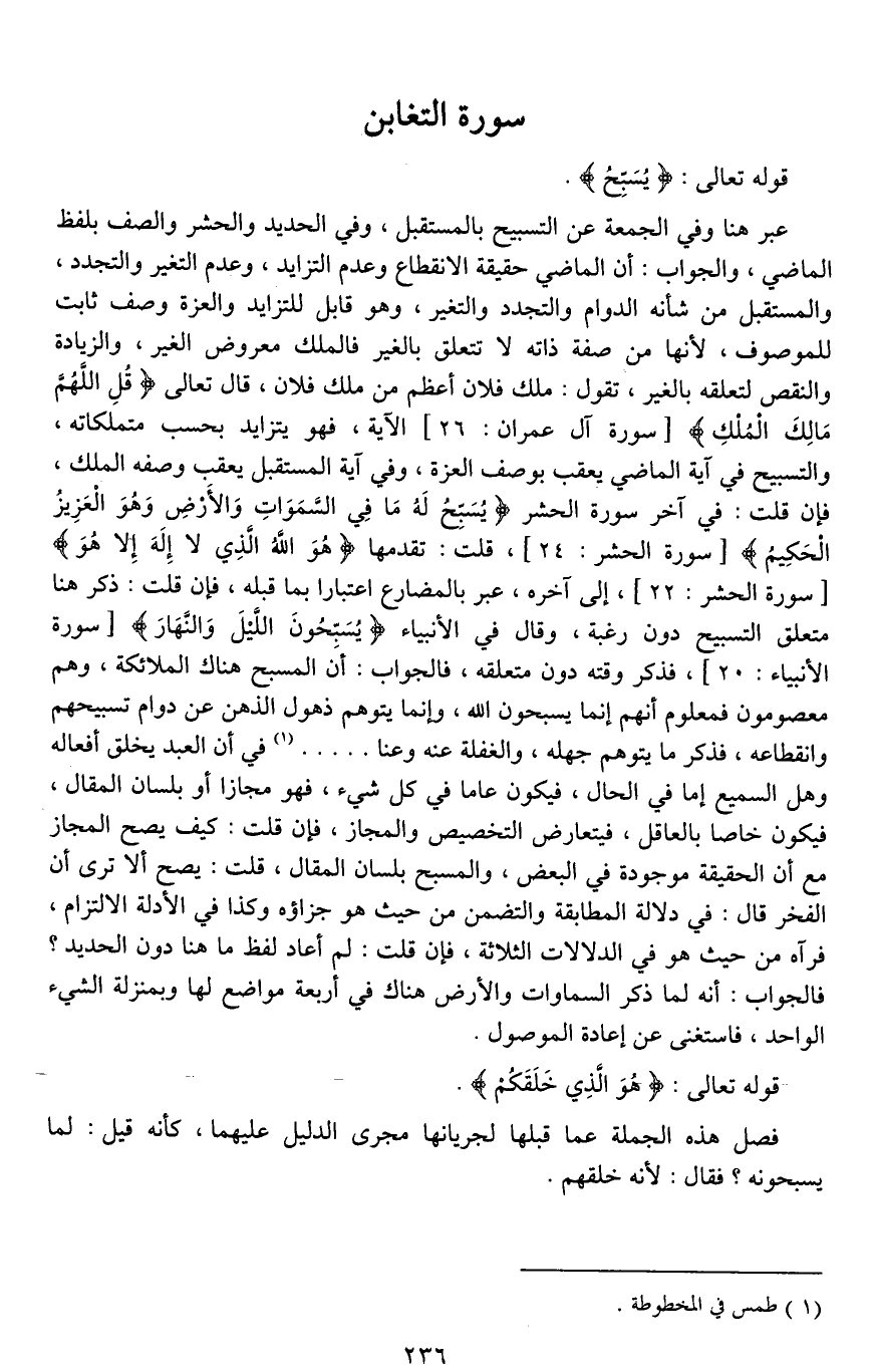 عبر هنا وفي الجمعة عن التسبيح بالمستقبل، وفي الحديد والحشر والصف بلفظ الماضي، والجواب: أن الماضي [حقيقته*] الانقطاع وعدم التزايد، وعدم التغير والتجدد، والمستقبل من شأنه الدوام والتجدد والتغير، وهو قابل للتزايد، والعزة وصف ثابت للموصوف، لأنها من صفة ذاته لَا تتعلق بالغير، [**والملك معروض الغير، والزيادة والنقص لتعلقه بالغير]، تقول: ملك فلان أعظم من ملك فلان، قال تعالى (قُلِ اللَّهُمَّ مَالِكَ الْمُلْكِ) الآية، فهو يتزايد بحسب متملكاته، والتسبيح في آية الماضي يعقب بوصف العزة، وفي آية المستقبل يعقب وصفه الملك، فإن قلت: في آخر سورة الحشر (يُسَبِّحُ لَهُ مَا فِي السَّمَاوَاتِ وَالْأَرْضِ وَهُوَ الْعَزِيزُ الْحَكِيمُ)، قلت: تقدمها (هُوَ اللَّهُ الَّذِي لَا إِلَهَ إِلَّا هُوَ) إلى آخره، عبر بالمضارع اعتبارا بما قبله، فإِن قلت: ذكر هنا متعلق التسبيح دون [وقته*]، وقال في الأنبياء (يُسَبِّحُونَ اللَّيْلَ وَالنَّهَارَ)، فذكر وقته دون متعلقه؟ فالجواب: أن المسبح هناك الملائكة، وهم معصومون، فمعلوم أنهم إنما يسبحون الله، وإنما يتوهم ذهول الذهن عن دوام تسبيحهم وانقطاعه، فذكر ما يتوهم جهله، والغفلة عنه وعنا [ ... ]. في أن العبد يخلق أفعاله وهل [التسبيح*] إما في الحال، فيكون عاما في كل شيء، فهو [مجاز*]، أو بلسان المقال، فيكون خاصا بالعاقل، فيتعارض التخصيص والمجاز، فإِن قلت: كيف يصح المجاز مع أن الحقيقة موجودة في البعض، والمسبح بلسان المقال؟ قلت: يصح؛ ألا ترى أن الفخر قال: في دلالة المطابقة والتضمن من حيث هو جزاؤه وكذا في [دلالة الالتزام*]، فرآه من حيث هو في [الدلالات الثلاث*]، فإن قلت: لم أعاد لفظ (ما) هنا دون الحديد؟ فالجواب: أنه لما ذكر السماوات والأرض هناك في أربعة مواضع، كانت بمنزلة الشيء الواحد*]، فاستغنى عن إعادة الموصول.