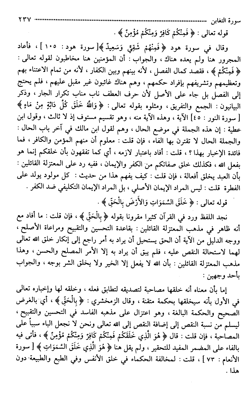 وقال في سورة هود (فَمِنْهُمْ شَقِيٌّ وَسَعِيدٌ)، فأعاد المجرور هنا ولم يعده هناك؟ والجواب: أن المؤمنين هنا مخاطبون لقوله تعالى: (فَمِنْكُمْ)، فقصد كمال الفصل، لأنه بينهم وبين الكفار، لأنه من تمام الاعتناء بهم وتعظيمهم وتشريفهم بإفراد حكمهم، وهم هناك غائبون غير مقبل عليهم، فلم يحتج إلى الفصل بل جاء على الأصل؛ لأن حرف العطف ناب مناب تكرار الجار، وذكر البيانيون: الجمع والتفريق، ومثلوه بقوله تعالى: (وَاللَّهُ خَلَقَ كُلَّ دَابَّةٍ مِنْ مَاءٍ) الآية، وهذه الآية منه، وهو تقسيم مستوف إذ لَا ثالث، وقول ابن عطية: إن هذه الجملة في موضع الحال، وهْم لقول ابن مالك في آخر باب الحال: والجملة الحال لَا تقترن بها الفاء، فإن قلت: معلوم أن منهم المؤمن والكافر، فما فائدة الإخبار بهذا؟، قلت: أفاد باعتبار لازمه، أي كما تفقهون بأن خلقكم إنما هو بفعل الله، فكذلك خلق صفاتكم من الكفر والإيمان، ففيه رد على المعتزلة القائلين: بأن العبد يخلق أفعاله، فإن قلت: كيف يفهم هذا من حديث: "كُلُّ مَوْلُودٍ يُولَدُ عَلَى الفِطْرَةِ" قلت: ليس المراد الإيمان الأصلي، بل المراد الإيمان التكليفي ضد الكفر.