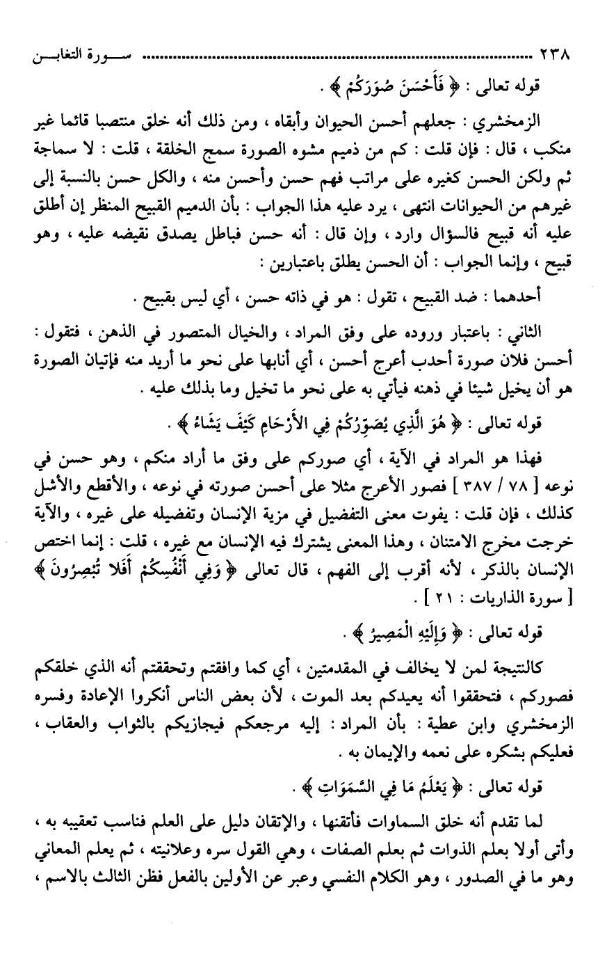 الزمخشري: جعلهم أحسن الحيوان [وأبهاه*]، ومن ذلك أنه خلق منتصبا قائما غير منكب، قال: فإِن قلت: كم من [دميم*] مشوَّه الصورة سمج الخلقة، قلت: لَا سماجة ثَمَّ، ولكن الحسن كغيره على مراتب فهم حسن وأحسن منه، والكل حسن بالنسبة إلى غيرهم من الحيوانات انتهى، يرد عليه هذا الجواب: بأن الدميم القبيح المنظر إن أطلق عليه أنه قبيح فالسؤال وارد، وإن قال: إنه حسن فباطل يصدق نقيضه عليه، وهو قبيح، وإنما الجواب: أن الحسن يطلق باعتبارين: