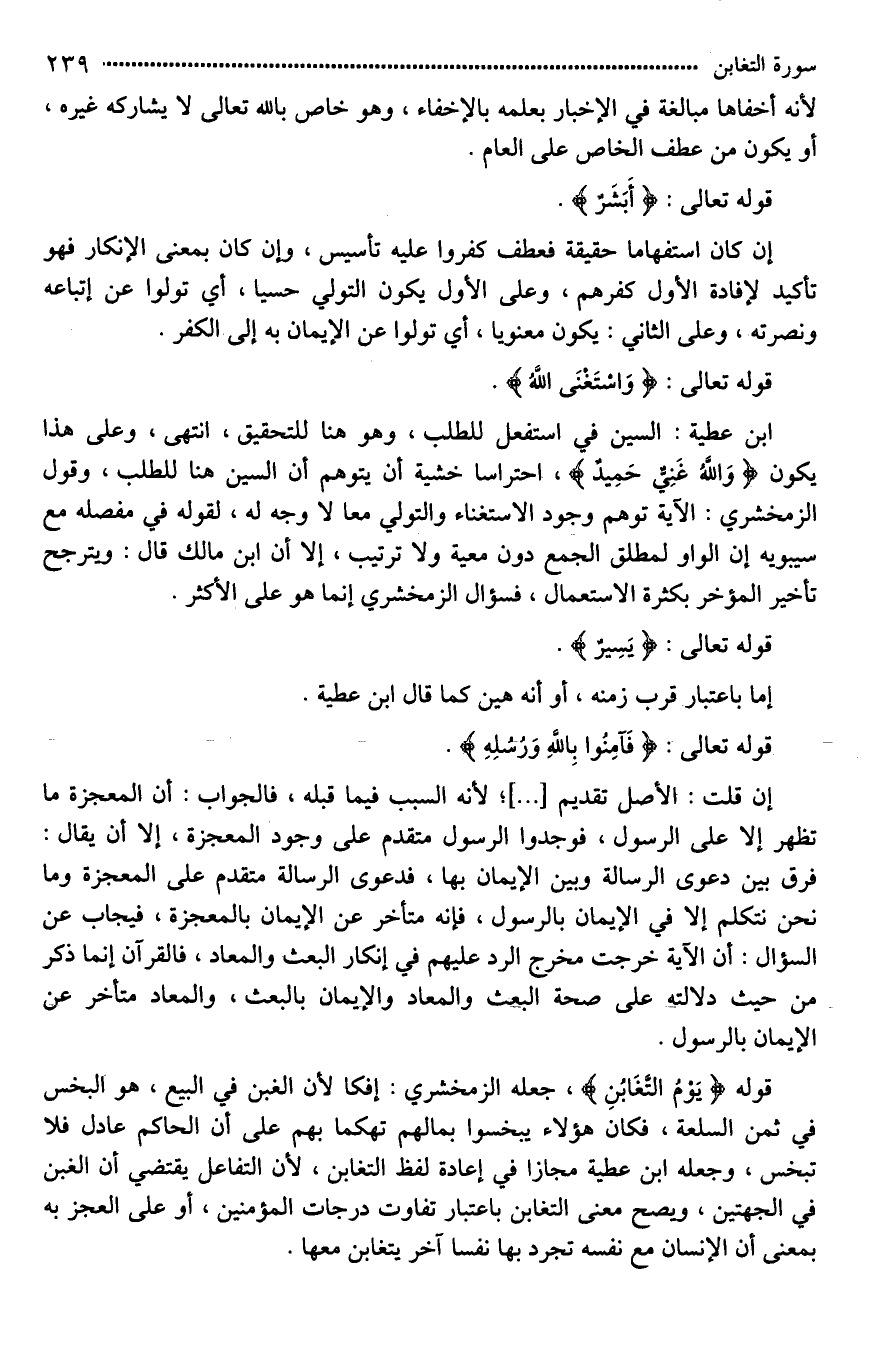 قوله (يَوْمُ التَّغَابُنِ ... (9) .. ، جعله الزمخشري: [تهكمًا*] لأن الغبن في البيع، هو البخس في ثمن السلعة، فكأنَّ هؤلاء يبخسوا بمالهم تهكما بهم على أن الحاكم عادل فلا [يبخس*]، وجعله ابن عطية مجازا في [إفادة*] لفظ التغابن، لأن التفاعل يقتضي أن الغبن في الجهتين، ويصح معنى التغابن باعتبار تفاوت درجات المؤمنين، أو على [**العجز به] بمعنى أن الإنسان مع نفسه [**يتجرد بها] [نفسا أخرى*] يتغابن معها.