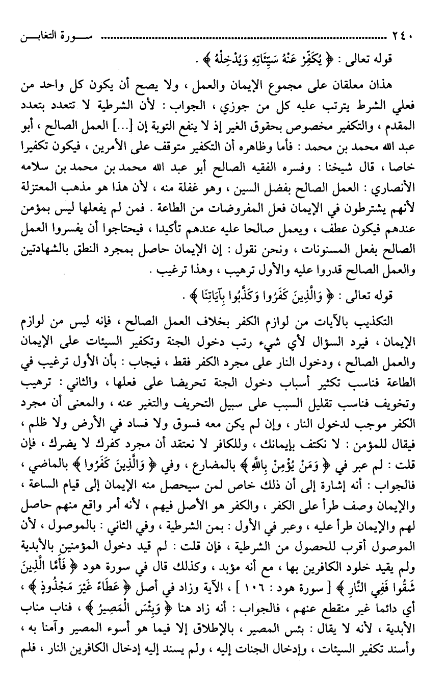 هذان معلقان على مجموع الإيمان والعمل، ولا يصح أن يكون كل واحد من فعلي الشرط يترتب عليه كل من جوزي، الجواب: لأن الشرطية لَا تتعدد بتعدد المقدم، والتكفير مخصوص بحقوق الغير إذ لَا [تنفع*] التوبة إن [ ... ] العمل الصالح، أبو عبد الله محمد بن محمد: فأما وظاهره أن التكفير متوقف على الأمرين، فيكون تكفيرا خاصا، قال شيخنا: وفسره الفقيه الصالح أبو عبد الله محمد بن محمد بن سلامه الأنصاري: العمل الصالح بفعل المسنونات، وهو غفلة منه، لأن هذا هو مذهب المعتزلة لأنهم يشترطون في الإيمان فعل المفروضات من الطاعة. فمن لم يفعلها ليس بمؤمن عندهم فيكون عطْف، (ويعمل صالحا) عليه عندهم تأكيدا، فيحتاجوا أن يفسروا العمل الصالح بفعل المسنونات، ونحن نقول: إن الإيمان حاصل بمجرد النطق بالشهادتين والعمل الصالح [مترتب عليه*]، والأول ترهيب، وهذا ترغيب.