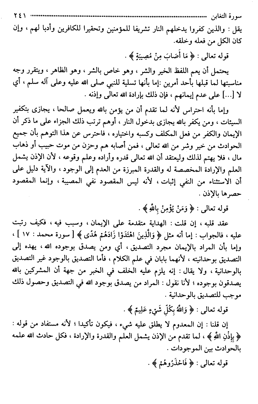 وإما بأنه احتراس؛ لأنه لما تقدم أن من يؤمن بالله ويعمل صالحا، يجازى بتكفير السيئات، ومن يكفر بالله يجازى بدخول النار، أوهَم ترتب ذلك الجزاء على ما ذكر أن الإيمان والكفر من فعل المكلف وكسبه واختياره، فاحترس عن هذا التوهم بأن جميع الحوادث من خير وشر من الله تعالى، فمن أصابه هم وحزن من موت حبيب أو ذهاب مال، فلا يهتم لذلك؛ وليعتقد أن الله تعالى قدره وأراده وعلم وقوعه، لأن الإذن يشمل العلم والإرادة المخصصة له والقدرة المبرزة من العدم إلى الوجود، والآية دليل على أن الاستثناء من النفي إثبات، لأنه ليس المقصود نفي المصيبة، وإنَّمَا المقصود حصرها بالإذن.