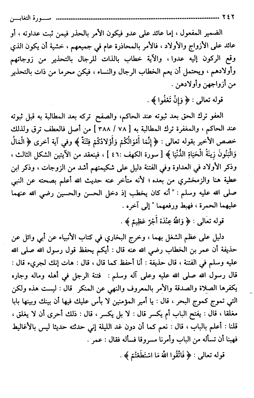 العفو ترك الحق بعد ثبوته عند الحاكم، والصفح تركه بعد المطالبة به قبل ثبوته عند الحاكم، والمغفرة ترك المطالبة به من أصل، فالعطف ترق ولذلك خصص الأخير بقوله تعالى: (إِنَّمَا أَمْوَالُكُمْ وَأَوْلَادُكُمْ فِتْنَةٌ) وفي آية أخرى (الْمَالُ وَالْبَنُونَ زِينَةُ الْحَيَاةِ الدُّنْيَا)، فينعقد من الآيتين الشكل الثالث، وذكر الأولاد في العداوة وفي الفتنة، دليل على شكيمتهم أشد من الزوجات، وذكر ابن عطية هنا والزمخشري من بعده؛ لأنه متأخر عنه حديث الله أعلم بصحته (¬1) عن النبي صلى الله عليه وسلم: "أنه كان يخطب إذ دخل الحسن والحسين رضي الله عنهما عليهما الحمرة، فهبط ورفعهما" إلى آخره.