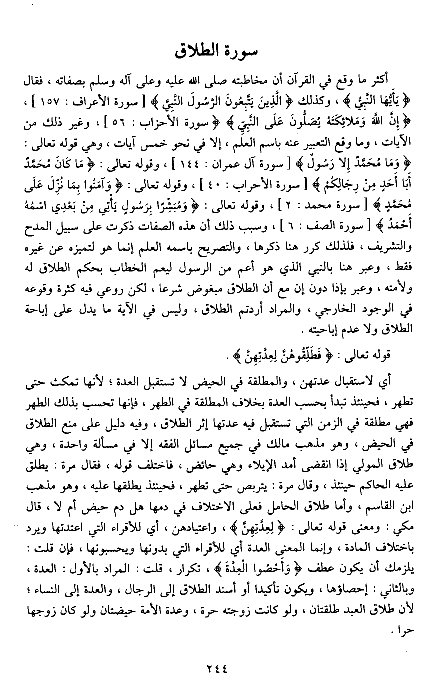 أكثر ما وقع في القرآن أن مخاطبته صلى الله عليه وعلى آله وسلم بصفاته، فقال (يَا أَيُّهَا النَّبِيُّ)، وكذلك (الَّذِينَ يَتَّبِعُونَ الرَّسُولَ النَّبِيَّ)، (إِنَّ اللَّهَ وَمَلَائِكَتَهُ يُصَلُّونَ عَلَى النَّبِيِّ)، وغير ذلك من الآيات، وما وقع التعبير عنه باسم العلَم، إلا في نحو خمس آيات، وهي قوله تعالى: (وَمَا مُحَمَّدٌ إِلَّا رَسُولٌ)، وقوله تعالى: (مَا كَانَ مُحَمَّدٌ أَبَا أَحَدٍ مِنْ رِجَالِكُمْ)، وقوله تعالى: (وَآمَنُوا بِمَا نُزِّلَ عَلَى مُحَمَّدٍ)، وقوله تعالى: (وَمُبَشِّرًا بِرَسُولٍ يَأْتِي مِنْ بَعْدِي اسْمُهُ أَحْمَدُ)، وسبب ذلك أن هذه الصفات ذكرت على سبيل المدح والتشريف، فلذلك كرر هنا ذكرها، والتصريح باسمه العلم إنما هو لتميزه عن غيره فقط، وعبر هنا بالنبي الذي هو أعم من الرسول ليعم الخطاب بحكم الطلاق له ولأمته، وعبر بـ إذا دون إن مع أن الطلاق مبغوض شرعا، لكن روعي فيه كثرة وقوعه في الوجود الخارجي، والمراد أردتم الطلاق، وليس في الآية ما يدل على إباحة الطلاق ولا عدم إباحيته.