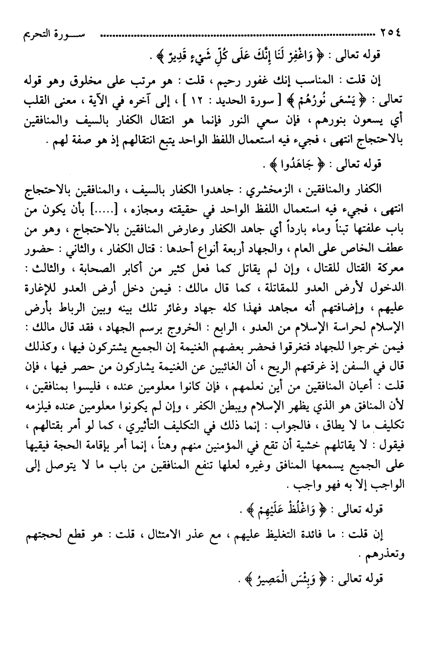 الزمخشري: [جاهد*] الكفار بالسيف، والمنافقين بالاحتجاج انتهى، [جيء*] فيه استعمال اللفظ الواحد في حقيقته ومجازه، [ ... ] بأن يكون من باب علفتها تبنا وماء باردا، أي جاهد الكفار وعارض المنافقين بالاحتجاج، وهو من عطف الخاص على العام، والجهاد أربعة أنواع: أحدها: قتال الكفار، والثاني: حضور معركة القتال للقتال، وإن لم يقاتل كما فعل كثير من أكابر الصحابة، والثالث: الدخول لأرض العدو للمقاتلة، كما قال مالك: فيمن دخل أرض العدو للإغارة عليهم، [وإضعافهم*] أنه مجاهد، فهذا كله جهاد، [**وغائر تلك بينه وبين الرباط بأرض الإسلام لحراسة الإسلام من العدو]، الرابع: الخروج برسم الجهاد، فقد قال مالك: فيمن خرجوا للجهاد [فتفرقوا*] فحضر بعضهم الغنيمة إن الجميع يشتركون فيها، وكذلك قال في السفن [إذا غمرتهم الريح*]، أن الغائبين عن الغنيمة يشاركون من [حضر*] فيها، فإن قلت: أعيان المنافقين من أين نعلمهم، فإن كانوا معلومين عنده، فليسوا بمنافقين، لأن المنافق هو الذي يظهر الإسلام ويبطن الكفر، وإن لم يكونوا معلومين عنده فيلزمه تكليف ما لَا يطاق؟ فالجواب: إنما ذلك في التكليف التأثيري، كما لو أمر بقتالهم، فيقول: لَا يقاتلهم خشية أن [يقع*] في المؤمنين منهم [وهن*]، إنما أمر بإقامة الحجة [فيلقيها*] على الجميع يسمعها المنافق وغيره، لعلها تنفع المنافقين من باب ما لَا يتوصل إلى الواجب إلا به فهو واجب.