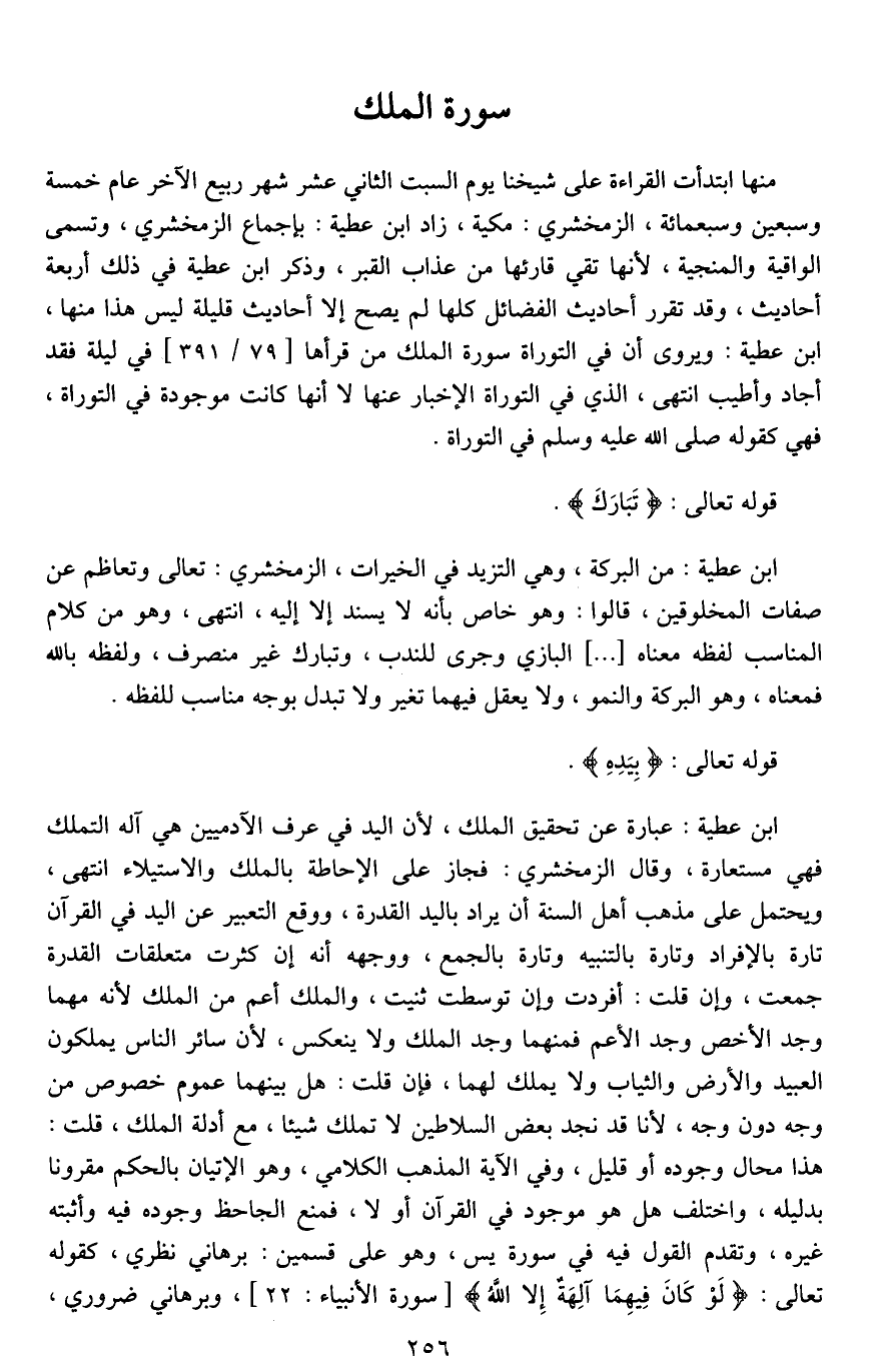 منها ابتدأت القراءة على شيخنا يوم السبت الثاني عشر شهر ربيع الآخر عام خمسة وسبعين وسبعمائة، الزمخشري: مكية، زاد ابن عطية: بإجماع. الزمخشري، وتسمى الواقية والمنجية، لأنها تقي قارئها من عذاب القبر، وذكر ابن عطية في ذلك أربعة أحاديث، وقد تقرر [أن*] أحاديث الفضائل كلها لم يصح [منها*] إلا أحاديث قليلة ليس هذا منها، ابن عطية: ويروى أن في التوراة سورة الملك من قرأها في ليلة فقد أجاد [وطيب*]. انتهى، الذي في التوراة الإخبار عنها لَا أنها كانت موجودة في التوراة، فهي [كوصفه*] صلى الله عليه وسلم في التوراة.