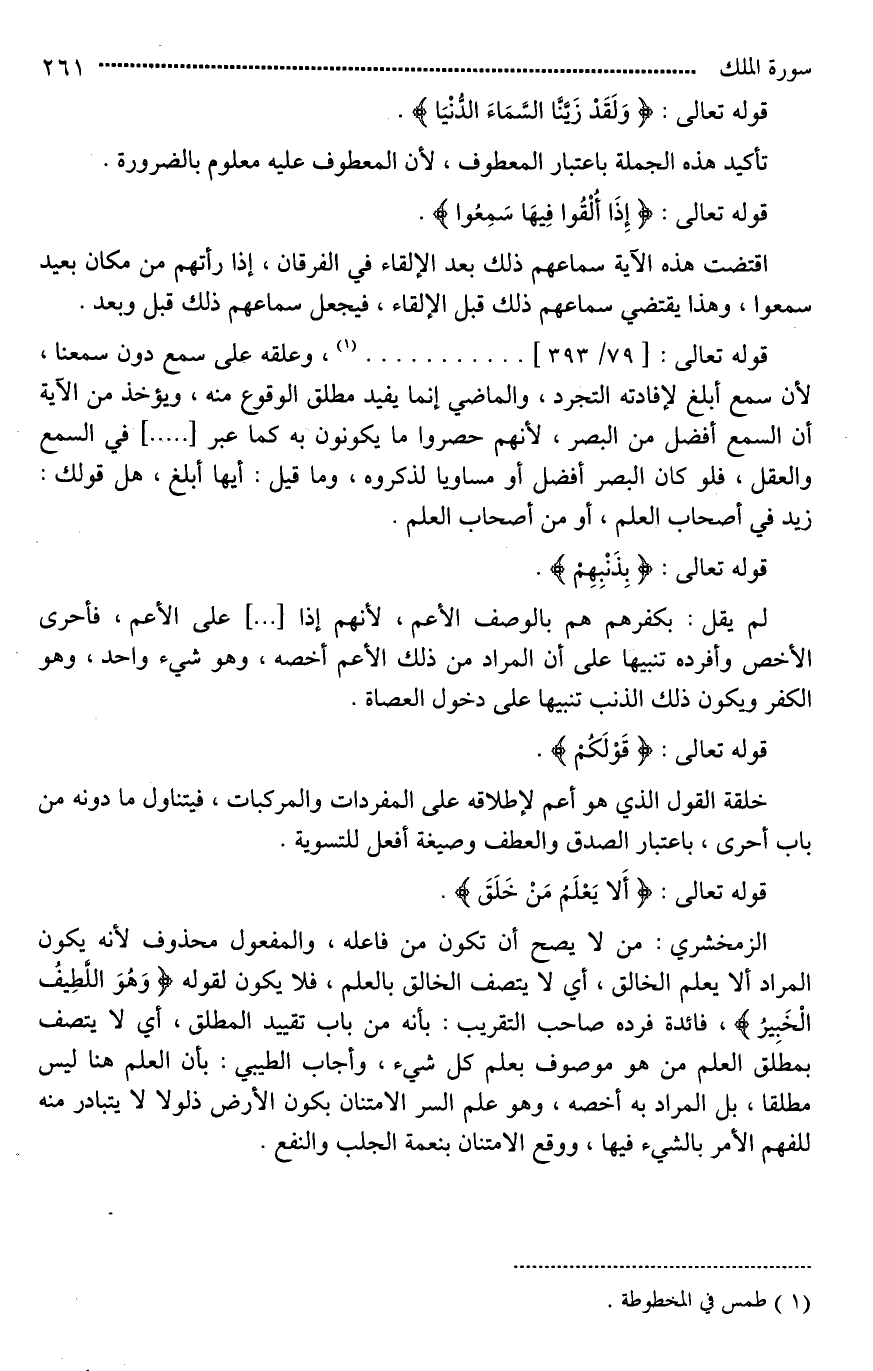 قوله تعالى: [وَقَالُوا لَوْ كُنَّا نَسْمَعُ ... (10)]، وعلقه على [نَسْمَعُ*] دون سمعنا؛ لأن [نَسْمَعُ*] أبلغ لإفادته التجرد، والماضي إنما يفيد مطلق الوقوع منه، ويؤخذ من الآية أن السمع أفضل من البصر، لأنهم حصروا ما يكونون به كما عبر في السمع والعقل، فلو كان البصر أفضل أو مساويا لذكروه، وما قيل: [أيهما*] أبلغ، هل قولك: زيد في أصحاب العلم، أو من أصحاب العلم.