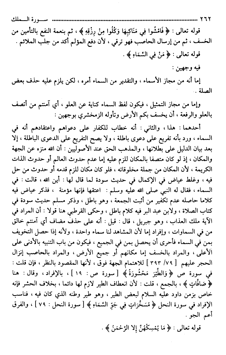 أحدهما: هذا، والثاني: أنه خطاب للكفار على دعواهم واعتقادهم أنه في السماء، ورد بأنه تفريع على دعوى باطلة، ولا يصح التفريع على الدعوى الباطلة، إلا بعد بيان الدليل على بطلانها، والمذهب الحق عند الأصوليين: أن الله منزه عن الجهة والمكان، إذ لو كان متصفا بالمكان للزم عليه إما عدم حدوث العالم، أو حدوث الذات الكريمة، لأن المكان من جملة مخلوقاته، فلو كان [في*] مكان للزم قدمه، أو حدوث من حل فيه، وغلط عياض في الإكمال في حديث سودة لما قال لها: أين الله؟ قالت: في السماء، فقال له النبي صلى الله عليه وسلم: اعتقها فإِنها مؤمنة، فذكر عياض فيه كلاما حاصله عدم تكفير من أثبت [الجهة*]، وهو باطل، وذكر مسلم حديث سودة في كتاب الصلاة، ولابن عبد البر فيه كلام باطل، وحكى القرطبي هنا قولا: أن المراد في الآية ملك العذاب، وهو جبريل، قال: قيل: إنه على حذف مضاف أي [أأمنتم*] خالق من في السماوات، وإفراد [السماء*] لأن المشاهد لنا سماء واحدة، ولأنه إذا حصل التخويف بمن في السماء، فأحرى أن يحصل بمن في الجميع، فيكون من باب التنبيه بالأدنى على الأعلى، والمراد بالخسف، إما مكانهم، أو جميع الأرض، والمراد بالحاصب إنزال الحجر عليهم؛ [اهتماما لجهة الفوق*]، لأنها المقصود بالنظر، فإن قلت: في سورة ص (وَالطَّيْرَ مَحْشُورَةً)، بالإفراد، وقال: هنا (صَافَّاتٍ ... (19) .. ، بالجمع، قلت: لأن انعطاف الطير لازم لها دائما، بخلاف الحشر؛ فإنه خاص بزمن داود - عليه السلام - لبعض الطير، وهو طير وطنه الذي كان فيه، فناسب الإفراد. [وفي*] سورة النحل (مُسَخرَاتٍ فِي جَوِّ السَّمَاءِ)، والفرق [**أعم الجو].