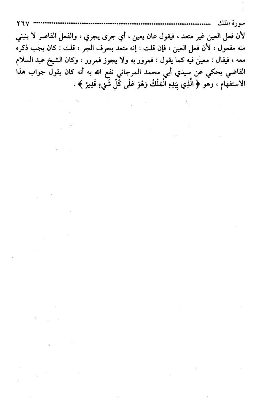 لأن فعل العين غير متعد، [فيقال*] عان يعين، أي جرى يجري، والفعل القاصر لَا ينبني منه مفعول، [من*] فعل العين، فإن قلت: إنه متعد بحرف الجر؟ قلت: كان يجب ذكره معه، فيقال: معين فيه كما يقول: [ممرور به*] ولا يجوز [ممرور*]، وكان الشيخ عبد السلام القاضي يحكي عن سيدي أبي محمد المرجاني نفع الله به أنه كان يقول جواب هذا الاستفهام، وهو (الَّذِي بِيَدِهِ الْمُلْكُ وَهُوَ عَلَى كُلِّ شَيْءٍ قَدِيرٌ).