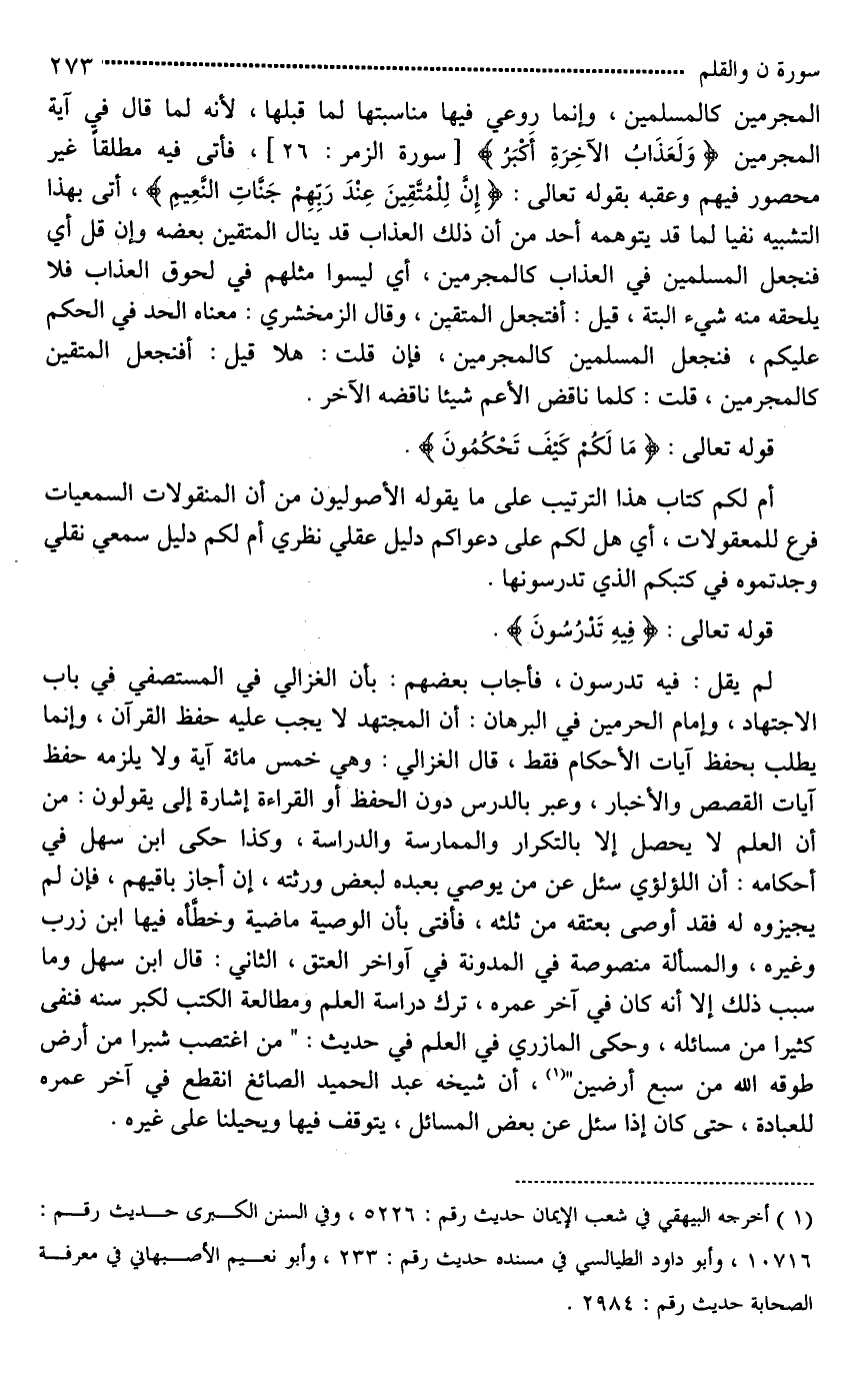 لم يقل: [فيه تحفظون*]، فأجاب بعضهم: بأن الغزالي في المستصفي في باب الاجتهاد، وإمام الحرمين في البرهان: [أجابا*] بأن المجتهد لَا يجب عليه حفظ القرآن، وإنما [يطالب*] بحفظ آيات الأحكام فقط، قال الغزالي: وهي خمس مائة آية، ولا يلزمه حفظ آيات القصص والأخبار، وعبر بالدرس دون الحفظ أو القراءة إشارة إلى [قولهم:*] إن العلم لَا يحصل إلا بالتكرار والممارسة والدراسة، وكذا حكى ابن سهل في أحكامه: أن اللؤلؤي سئل [عمن*] يوصي بعبده لبعض ورثته، إن أجاز باقيهم، فإن لم يجيزوه له فقد أوصى بعتقه من ثلثه، فأفتى بأن الوصية ماضية، وخطأه فيها ابن زرب وغيره، والمسألة منصوصة في المدونة في آواخر العتق، الثاني: قال ابن سهل وما سبب ذلك إلا أنه كان في آخر عمره، ترك دراسة العلم ومطالعة الكتب لكبر سنه [فنسي*] كثيرا من مسائله، وحكى المازري في العلم في حديث: " [مَنِ اقْتَطَعَ شِبْرًا مِنَ الْأَرْضِ ظُلْمًا، طَوَّقَهُ اللهُ إِيَّاهُ يَوْمَ الْقِيَامَةِ مِنْ سَبْعِ أَرَضِينَ*] "، أن شيخه عبد الحميد الصائغ انقطع في آخر عمره للعبادة، حتى كان إذا سئل عن بعض المسائل، يتوقف فيها ويحيلنا على غيره.