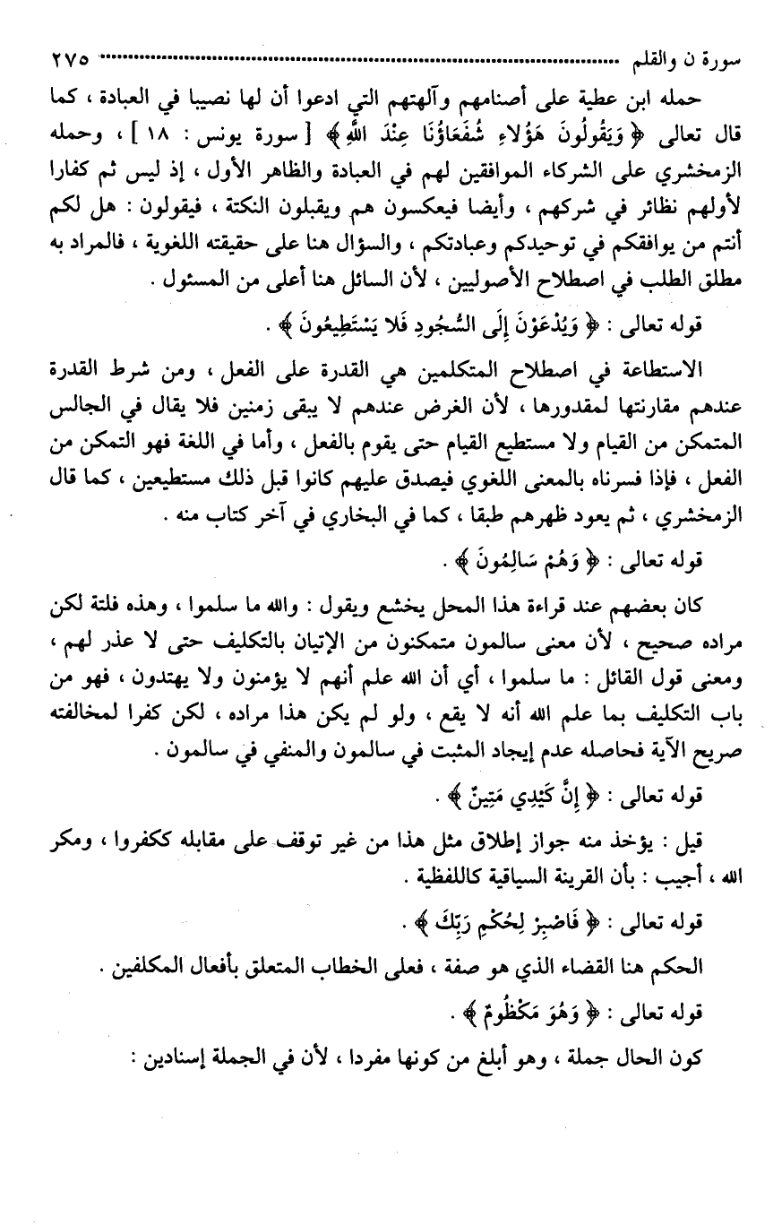 الاستطاعة في اصطلاح المتكلمين هي القدرة على الفعل، ومن شرط القدرة عندهم مقارنتها لمقدورها، لأن الغرض عندهم لَا يبقى زمنين، فلا يقال في الجالس المتمكن من القيام، [لا يستطيع*] القيام حتى يقوم بالفعل، وأما في اللغة فهو التمكن من الفعل، فإذا فسرناه بالمعنى اللغوي فيصدق عليهم كانوا قبل ذلك مستطيعين، كما قال الزمخشري، ثم يعود ظهرهم طبقا، كما في البخاري في آخر كتاب منه.