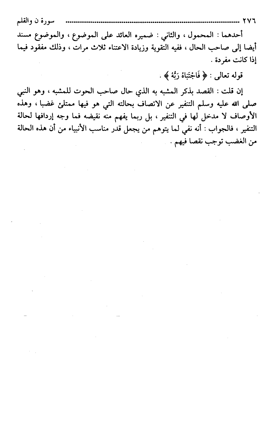 إن قلت: القصد بذكر المشبه به الذي [هو*] حال صاحب الحوت للمشبه، وهو النبي صلى الله عليه وسلم التنفير عن الاتصاف بحالته التي هو فيها [مملوء غيظا*]، وهذه الأوصاف لَا مدخل لها في التنفير، بل ربما يفهم منه نقيضه، فما وجه إردافها لحالة التنفير؟ فالجواب: أنه نفي لما يتوهم من [جعْلِ*] قدرٍ مناسبٍ للأنبياء من هذه الحالة من الغضب [يوجب*] نقصًا فيهم.