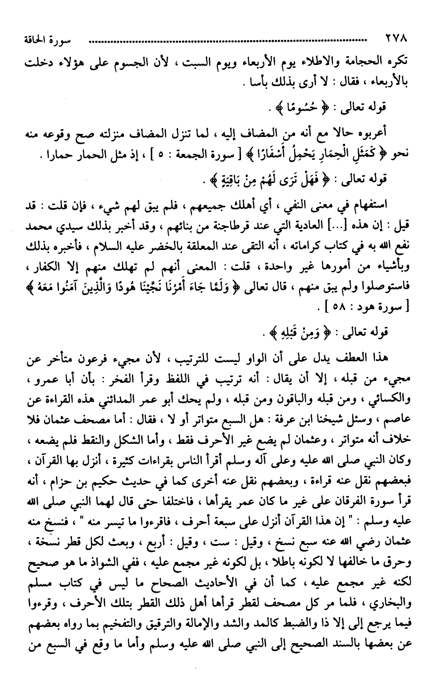 هذا العطف يدل على أن الواو ليست للترتيب، لأن مجيء فرعون متأخر عن مجيء (مَنْ قَبْلَهُ)، إلا أن يقال: أنه ترتيب في اللفظ، [قال الفخر: قَرَأَ أَبُو عَمْرٍو وَعَاصِمٌ وَالْكِسَائِيُّ*]، (وَمَنْ قِبَلِهِ) والباقون (وَمَنْ قَبْلَهُ)، ولم يحك أبو عمر المدائني هذه القراءة عن عاصم، وسئل شيخنا ابن عرفة: هل السبع متواتر أو لَا، فقال: أما مصحف عثمان فلا خلاف أنه متواتر، وعثمان لم يضع غير الأحرف فقط، وأما الشكل والنقط فلم يضعه، وكان النبي صلى الله عليه وعلى آله وسلم أقرأ النَّاس بقراءات كثيرة، أنزل بها القرآن، فبعضهم نقل عنه قراءة، وبعضهم نقل عنه أخرى؛ كما في حديث حكيم بن حزام، أنه قرأ سورة الفرقان على غير ما كان عمر يقرأها، فاختلفا حتى قال لهما النبي صلى الله عليه وسلم: "إن هذا القرآن أنزل على سبعة أحرف، فاقرءوا ما تيسر منه"، فنسخ منه عثمان رضي الله عنه سبع نسخ، وقيل: ست، وقيل: أربع، وبعث لكل قطر نسخة، وحرَّق ما خالفها لَا لكونه باطلا، بل لكونه غير مجمع عليه، ففي الشواذ ما هو صحيح لكنه غير مجمع عليه، كما أن في الأحاديث الصحاح ما ليس في كتاب مسلم والبخاري، فلما مر كل مصحف لقطر قرأها أهل ذلك القطر بتلك الأحرف، وقرءوا فيما يرجع إلى [التزام الضبط*]، كالمد [والقصر*] والإمالة والترقيق والتفخيم بما رواه بعضهم عن [بعضٍ*] بالسند الصحيح إلى النبي صلى الله عليه وسلم، وأما ما وقع في السبع من
