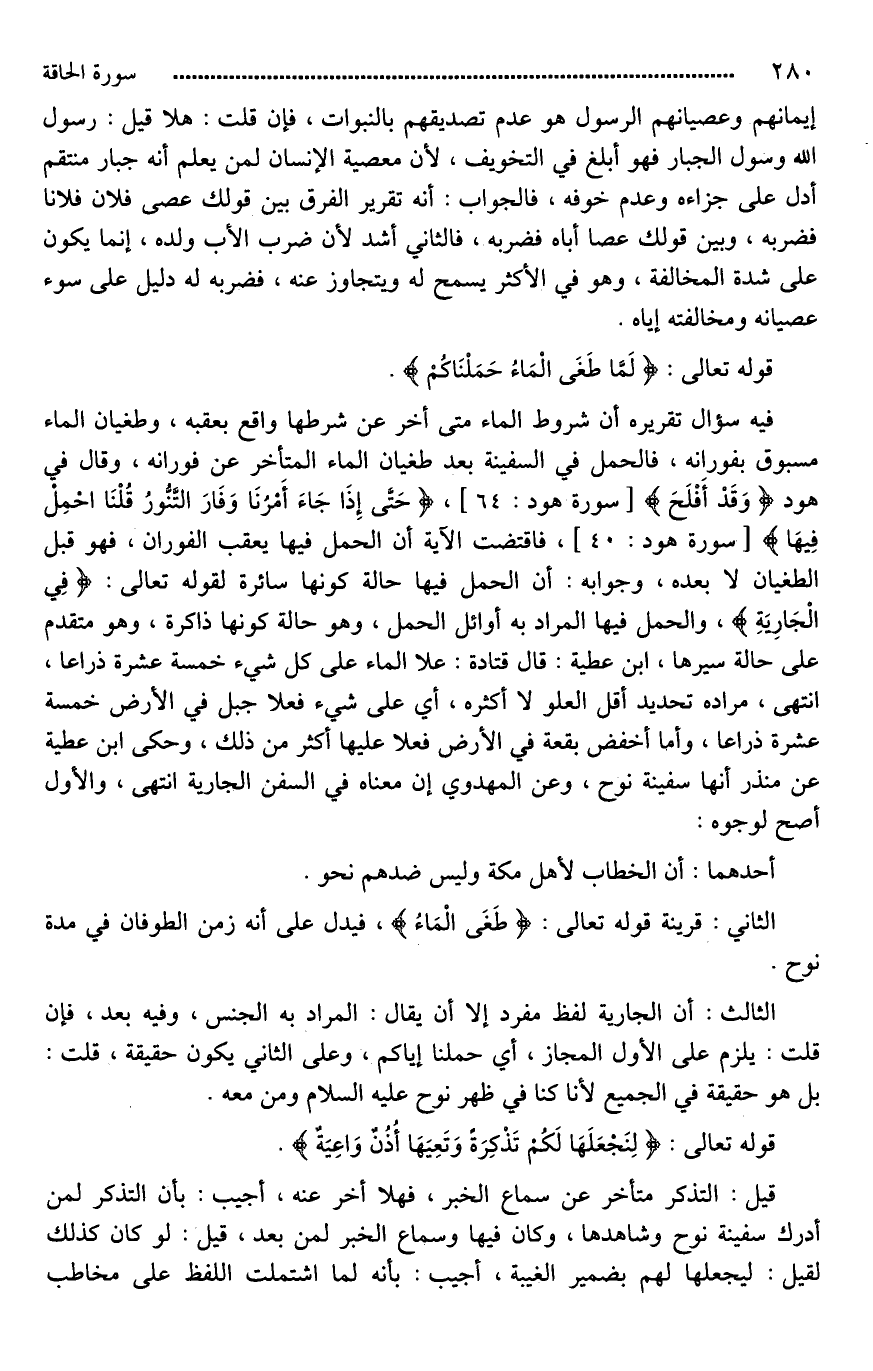 فيه سؤال تقريره أن [**فوران الماء متأخر عن شرطها واقع بعقبه]، وطغيان الماء مسبوق بفورانه، فالحمل في السفينة بعد طغيان الماء المتأخر عن فورانه، وقال في هود (وَقَدْ أَفْلَحَ)، (حَتَّى إِذَا جَاءَ أَمْرُنَا وَفَارَ التَّنُّورُ قُلْنَا احْمِلْ فِيهَا)، فاقتضت الآية أن الحمل فيها يعقب الفوران، فهو قبل الطغيان لَا بعده، وجوابه: أن الحمل فيها حالة كونها سائرة لقوله تعالى: (فِي الْجَارَيةِ)، والحمل فيها المراد به أوائل الحمل، وهو حالة كونها [واقفة*]، وهو متقدم على حالة سيرها، ابن عطية: قال قتادة: علا الماء على كل شيء خمسة عشرة ذراعا، انتهى، مراده تحديد أقل العلو لَا أكثره، أي [أعلى*] شيء فعلا جبل في الأرض خمسة عشرة ذراعا، وأما أخفض بقعة [في*] الأرض فعلا عليها أكثر من ذلك، وحكى ابن عطية عن منذر أنها سفينة نوح، وعن المهدوي إن معناه في السفن الجارية. انتهى، والأول أصح لوجوه: