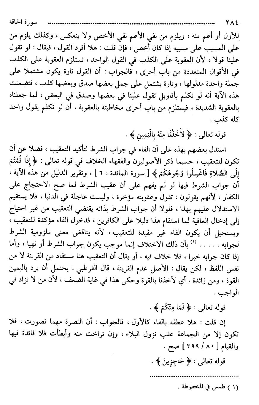 استدل بعضهم بهذه على أن الفاء في جواب الشرط لتأكيد التعقيب، فضلا عن أن تكون للتعقيب، حسبما ذكر الأصوليون والفقهاء الخلاف في قوله تعالى: (إِذَا قُمْتُمْ إِلَى الصَّلَاةِ فَاغْسِلُوا وُجُوهَكُمْ)، وتقرير الدليل من هذه الآية، أَن جواب الشرط فيها لو لم يفهم على [أنه*] عقيب الشرط لما صح الاحتجاج على الكفار، لأنهم يقولون: تقوَّل، وعقوبته مؤخرة، وليست عاجلة في الدنيا، فلا يستقيم الاستدلال عليهم بهذا، فلولا أن جواب الشرط بذاته يقتضي التعقيب من غير احتياج إلى إدخال [العاقبة*] لما استقام هذا دليلا على الكافرين، فدخول الفاء مؤكدة للتعقيب، ويستحيل أن يكون الفاء غير مفيدة للتعقيب، لأنه يناقض معنى ملزومية الشرط لجوابه [ ... ]. بأن ذلك الاختلاف [**إنما موجب يكون جواب] الشرط أو نهيا، وأما إذا كان جوابه خبرا، فلا خلاف فيه، أو يقال إن التعقيب هنا مستفاد من القرينة لَا من نفس اللفظ، لكن يقال: الأصل عدم القرينة، قال القرطبي: يحتمل أن [يريد*] باليمين القوة، و (من) زائدة، أي [لأخذناه*] بالقوة، وحكى هذا في غاية الضعف، لأن (من) لَا تزاد في الواجب.