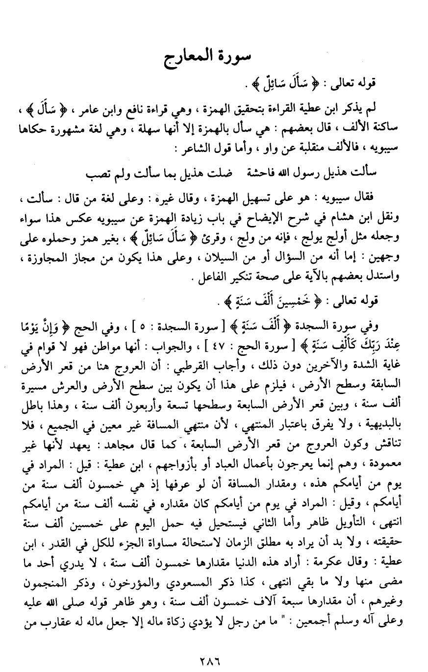 وفي سِورة السجدة (أَلْفَ سَنَةٍ)، وفي الحج (وَإِنَّ يَوْمًا عِنْدَ رَبِّكَ كَأَلْفِ سَنَةٍ)، والجواب: أنها مواطن فهو [لأقوام*] في غاية الشدة والآخرين دون ذلك، وأجاب القرطبي: أن العروج هنا من قعر الأرض [السابعة*] وسطح الأرض، فيلزم على هذا أن يكون بين سطح الأرض والعرش مسيرة ألف سنة، وبين قعر الأرض السابعة وسطحها تسعة وأربعون ألف سنة، وهذا باطل [بالبديهة*]، ولا يفرق باعتبار المنتهي، لأن منتهي المسافة غير معين في الجميع، فلا تناقش، وكون العروج من قعر الأرض السابعة، كما قال مجاهد: [يصعب*] لأنها غير [معهودة*]، وهم إنما يعرجون بأعمال العباد أو [بأرواحهم*]، ابن عطية: قيل: المراد في يوم من أيامكم هذه، ومقدار المسافة أن لو [عرجها*] إذ هي خمسون ألف سنة من أيامكم، وقيل: المراد في يوم من أيامكم كان مقداره في نفسه ألف سنة من أيامكم انتهى، التأويل [الأول*] ظاهر، وأما الثاني فيستحيل فيه حمل اليوم على خمسين ألف سنة [حقيقة*]، ولا بد أن يراد به مطلق الزمان؛ لاستحالة مساواة الجزء للكل في القدر، ابن عطية: وقال عكرمة: أراد هذه الدنيا مقدارها خمسون ألف سنة، لَا يدري أحد ما مضى منها، ولا ما بقي انتهى، كذا ذكر المسعودي والمؤرخون، وذكر المنجمون وغيرهم، أن مقدارها سبعة آلاف [وخمسون*] ألف سنة، وهو ظاهر قوله صلى الله عليه وعلى آله وسلم أجمعين: "ما من رجل لَا يؤدي زكاة ماله إلا جعل ماله له عقارب من