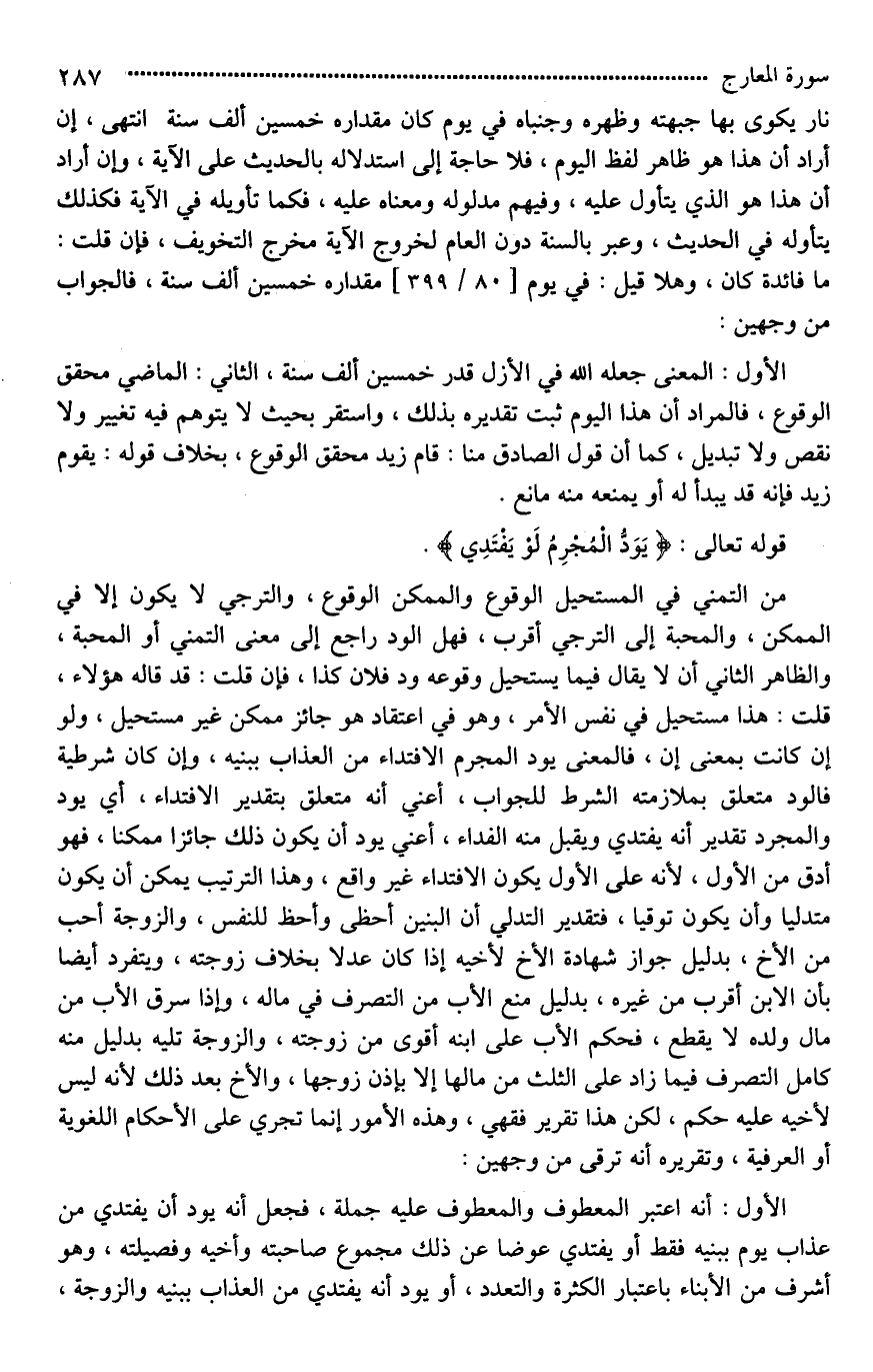 من التمني في المستحيل الوقوع والممكن الوقوع، والترجي لَا يكون إلا في الممكن، والمحبة إلى الترجي أقرب، فهل الود راجع إلى معنى التمني أو المحبة، والظاهر الثاني، [فلَا يقال*] فيما يستحيل وقوعه ود فلان كذا، فإن قلت: قد قاله هؤلاء؟ قلت: هذا مستحيل في نفس الأمر، وهو في [اعتقادهم*] جائز ممكن غير مستحيل، و (لو) إن كانت بمعنى (إن)، فالمعنى يود المجرم الافتداء من العذاب ببنيه، وإن [كانت*] شرطية فالود متعلق بملازمته الشرط للجواب، أعني أنه متعلق بتقدير الافتداء، أي [يود المجرم تقديرا*] أنه يفتدي ويقبل منه الفداء، أعني يود أن يكون ذلك جائزا ممكنا، فهو أدق من الأول، لأنه على الأول يكون الافتداء غير واقع، وهذا الترتيب يمكن أن يكون متدليا، وأن يكون [ترقيا*]، فتقدير التدلي أن البنين أحظى وأحظ للنفس، والزوجة أحب من الأخ، بدليل جواز شهادة الأخ لأخيه إذا كان عدلا بخلاف زوجته، [وينفرد*] أيضا بأن الابن أقرب من غيره، بدليل منع الأب من التصرف في ماله، وإذا سرق الأب من مال ولده لَا يقطع، فحكم الأب على ابنه أقوى من زوجته، والزوجة تليه بدليل [أنه لا يملك*] التصرف فيما زاد على الثلث من مالها إلا بإذن زوجها، والأخ بعد ذلك لأنه ليس لأخيه عليه حكم، لكن هذا تقرير فقهي، وهذه الأمور إنما تجري على الأحكام اللغوية أو العرفية، وتقريره أنه ترقٍّ من وجهين: