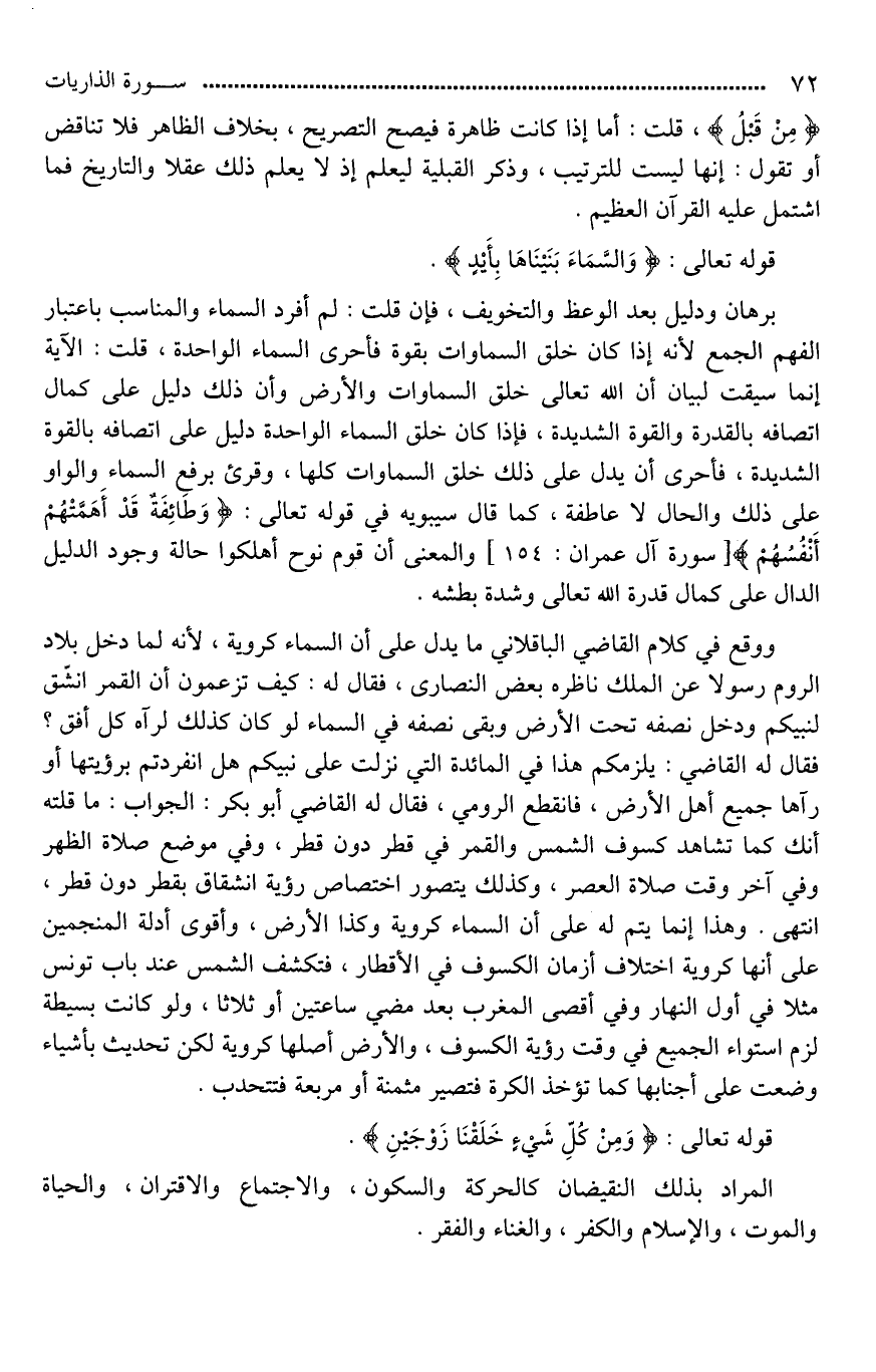 ووقع في كلام القاضي الباقلاني ما يدل على أن السماء [كورية*]، لأنه لما دخل بلاد الروم رسولا عن الملك ناظره بعض النصارى، فقال له: كيف تزعمون أن القمر انشَّق لنبيكم ودخل نصفه تحت الأرض وبقي نصفه في السماء لو كان كذلك لرآه كل أفق؟ فقال له القاضي: يلزمكم هذا في المائدة التي نزلت على نبيكم هل انفردتم برؤيتها أو رآها جميع أهل الأرض، فانقطع الرومي، فقال له القاضي أبو بكر: الجواب: ما قلته أنك كما تشاهد كسوف الشمس والقمر في قطر دون قطر، وفي موضع صلاة الظهر وفي آخر وقت صلاة العصر، وكذلك يتصور اختصاص رؤية انشقاق بقطر دون قطر، انتهى. وهذا إنما يتم له على أن السماء [كورية*] وكذا الأرض، وأقوى أدلة المنجمين على أنها [كورية*] اختلاف أزمان الكسوف في الأقطار، [فتكسف*] الشمس عند باب تونس مثلا في أول النهار وفي أقصى المغرب بعد مضي ساعتين أو ثلاثا، ولو كانت بسيطة لزم استواء الجميع في وقت رؤية الكسوف، والأرض أصلها [كورية*] لكن [تتحدب*] بأشياء وضعت على أجنابها كما تؤخذ الكرة فتصير مثمنة أو مربعة فتتحدب.