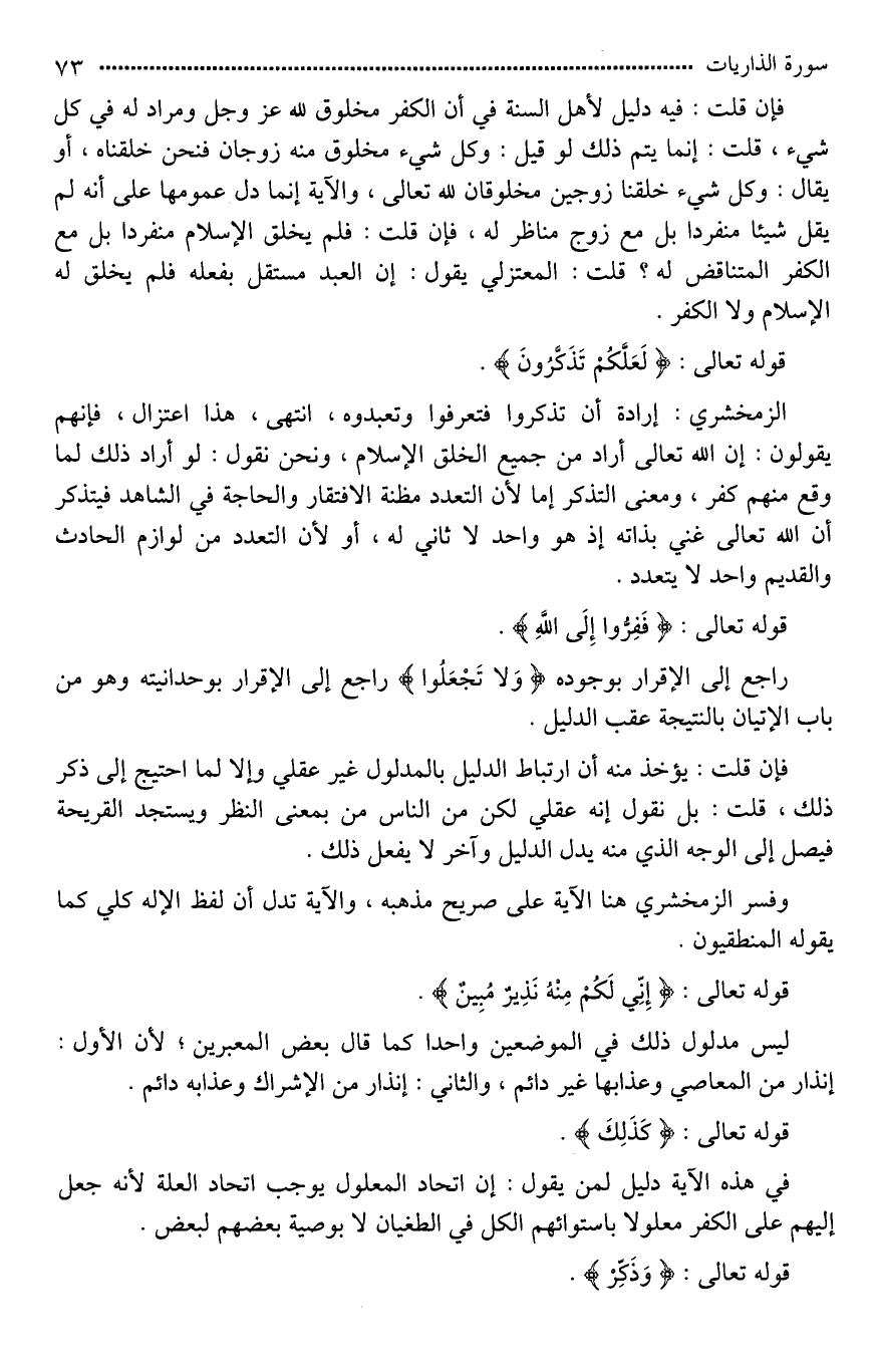 فإن قلت: فيه دليل لأهل السنة في أن الكفر مخلوق لله عز وجل ومراد له في كل شيء، قلت: إنما يتم ذلك لو قيل: وكل شيء مخلوق منه زوجان فنحن خلقناه، أو يقال: وكل شيء خلقنا زوجين مخلوقان لله تعالى، والآية إنما دل عمومها على أنه لم يقل شيئا منفردا؛ بل مع زوج مناظر له، فإن قلت: فلم يخلق الإسلام منفردا بل مع الكفر [المناقض*] له؟ قلت: المعتزلي يقول: إن العبد مستقل بفعله فلم يخلق له الإسلام ولا الكفر.