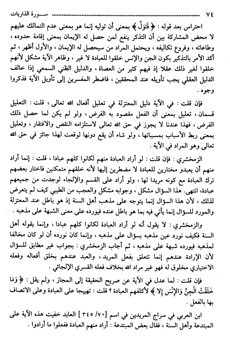 الزمخشري: فإن قلت: لو أراد العبادة منهم لكانوا كلهم عبادا، قلت: إنما أراد منهم أن [يعبدوه*] مختارين للعبادة لَا مضطرين إليها؛ لأنه خلقهم [ممكنين*] فاختار بعضهم ترك العبادة مع كونه مريدا لها، ولو أراد على [القسر*] والإلجاء لوجدت من جميعهم عبادة، انتهى. هذا السؤال مشكل، وجوابه مشكل والعجب من الطيبي كيف لم يتعرض لذلك، لأن هذا السؤال إنما يتوجه على مذهب أهل السنة إذ هو باطل عند المعتزلة والمورد للسؤال إنما يأتي فيه بما هو باطل عنده فيورده على معنى الشبهة على مذهبه.
