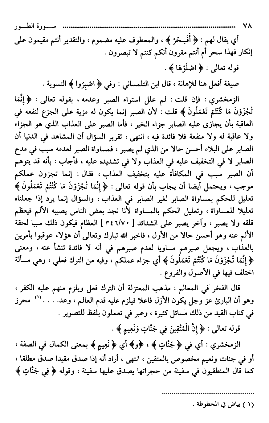 الزمخشري: فإن قلت: لم علل استواء الصبر وعدمه، بقوله تعالى: (إِنَّمَا تُجْزَوْنَ مَا كُنْتُمْ تَعْمَلُونَ) قلت: لأن الصبر إنما يكون له مزية على الجزع لنفعه في العاقبة بأن يجازى عليه الصابر جزاء الخير، فاما الصبر على العذاب الذي هو الجزاء ولا عاقبة له ولا منفعة فلا فائدة فيه، انتهى، تقرير السؤال أن المشاهد في الدنيا أن الصابر على البلاء أحسن حالا من الذي لم يصبر، فمساواة الصبر لعدمه سبب في مدح الصابر لَا في التخفيف عليه في العذاب ولا في تشديده عليه، فأجاب: بأنه قد يتوهم أن الصبر سبب في المكافأة عليه بتخفيف العذاب، فقال: إنما تجزون عملكم موجب، ويحتمل أيضا أن يجاب بأن قوله تعالى: (إِنَّمَا تُجْزَوْنَ مَا كُنْتُمْ تَعْمَلُونَ) تعليل للحكم بمساواة الصابر لغير الصابر في العذاب، والسؤال إنما يرد إذا جعلناه تعليلا للمساواة، وتعليل الحكم بالمساواة لأنا نجد بعض النَّاس يصيبه الألم فيعظم قلقه ولا يصبر، وآخر يصبر على الشدائد العظام فيكون ذلك سببا لحقة الألم عنه وهو أحسن حالا من الأول، فأخبر الله تبارك وتعالى أن هؤلاء عوقبوا بأمرين بالعذاب، ويجعل صبرهم مساويا لعدم صبرهم في أنه لَا فائدة تنشأ عنه، ومعنى (إِنَّمَا تُجْزَوْنَ مَا كُنْتُمْ تَعْمَلُونَ) أي جزاء عملكم، وفيه من الترك فعلي، وهي مسألة اختلف فيها في الأصول والفروع.