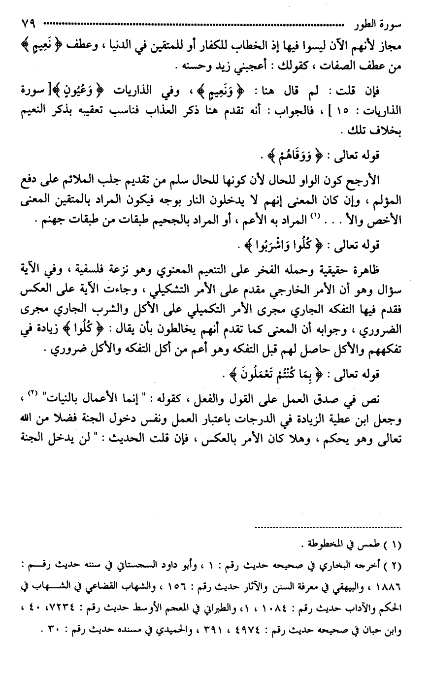 [ظاهره حقيقته*]، وحمله الفخر على التنعيم المعنوي وهو نزعة فلسفية، وفي الآية سؤال وهو أن الأمر الخارجي مقدم على الأمر [التكميلي*]، وجاءت الآية على العكس فقدم فيها التفكه الجاري مجرى الأمر التكميلي على الأكل والشرب الجاري مجرى الضروري، وجوابه أن المعنى كما تقدم أنهم يخالطون بأن يقال: (كُلُوا) زيادة في تفكههم والأكل حاصل لهم قبل التفكه وهو أعم من أكل التفكه والأكل ضروري.
