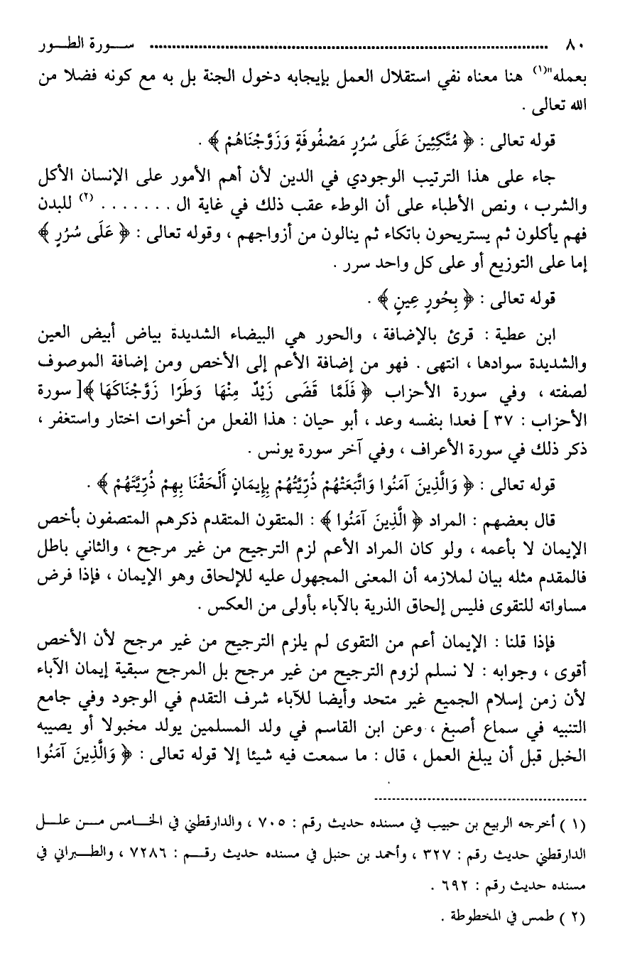قال بعضهم: المراد (الَّذِينَ آمَنُوا): المتقون المتقدم ذكرهم المتصفون بأخص الإيمان لَا بأعمه، ولو كان المراد الأعم لزم الترجيح من غير مرجح، والثاني باطل فالمقدم مثله بيان لملازمة أن المعنى المجهول عليه للإلحاق وهو الإيمان، فإذا فرض مساواته للتقوى فليس إلحاق الذرية بالآباء بأولى من العكس.
