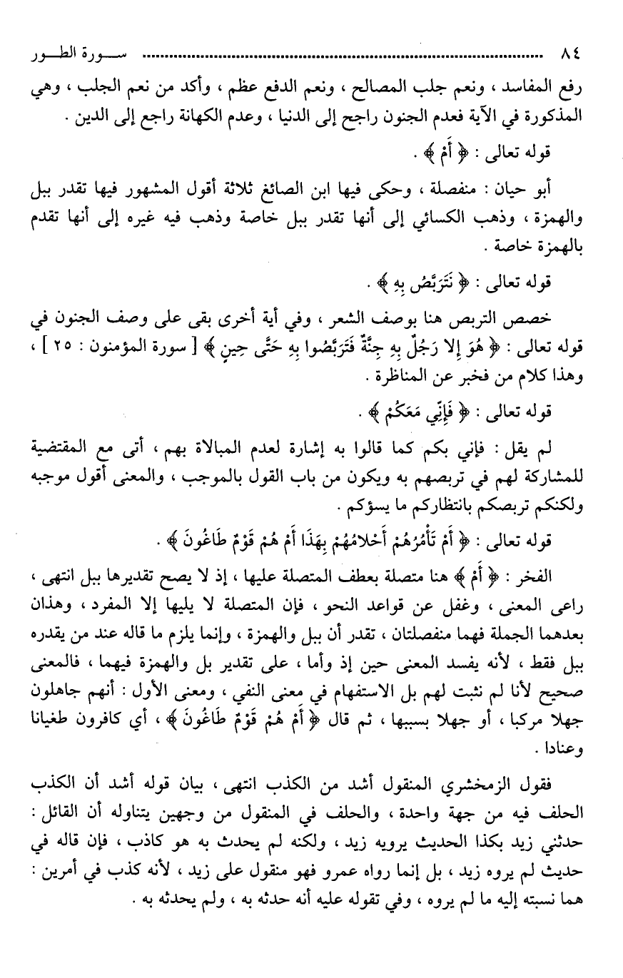 الفخر: (أَمْ) هنا متصلة بعطف المتصلة عليها، إذ لَا يصح تقديرها بـ بل انتهى، راعى المعنى، وغفل عن قواعد النحو، فإن المتصلة لَا يليها إلا المفرد، وهذان بعدهما الجملة فهما منفصلتان، تقدر أن بـ بل والهمزة، وإنما يلزم ما قاله عند من يقدره بـ بل فقط، لأنه يفسد المعنى حين إذ وأما على تقدير بل والهمزة فيهما، فالمعنى صحيح لأنا لم نثبت لهم بل الاستفهام في معنى النفي، ومعنى الأول: أنهم جاهلون جهلا مركبا، أو جهلا بسببها، ثم قال (أَمْ هُمْ قَوْمٌ طَاغُونَ)، أي كافرون طغيانا وعنادا.