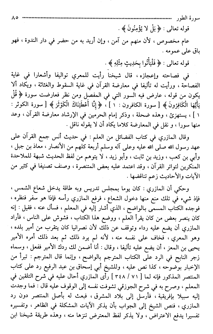 في فصاحته وإعجازه، قال شيخنا رأيت للمعري تواليفا وأشعارا في غاية الفصاحة، ورأيت له تأليفا في معارضة القرآن في غاية السقوط والغثاثة، ويكاد ألا يكون من قوله، عارض فيه السور التي في المفصل ومن نظر [معارضة*] سورة (قُلْ يَا أَيُّهَا الْكَافِرُونَ)، (إِنَّا أَعْطَيْنَاكَ الْكَوْثَرَ)، يستهزئ، وهذه ضحلة، وذكر إمام الحرمين في الإرشاد معارضة القرآن، وعد منها سورا، ونقل في المعارضة كلاما يكاد أن لَا يقوله ناقل.