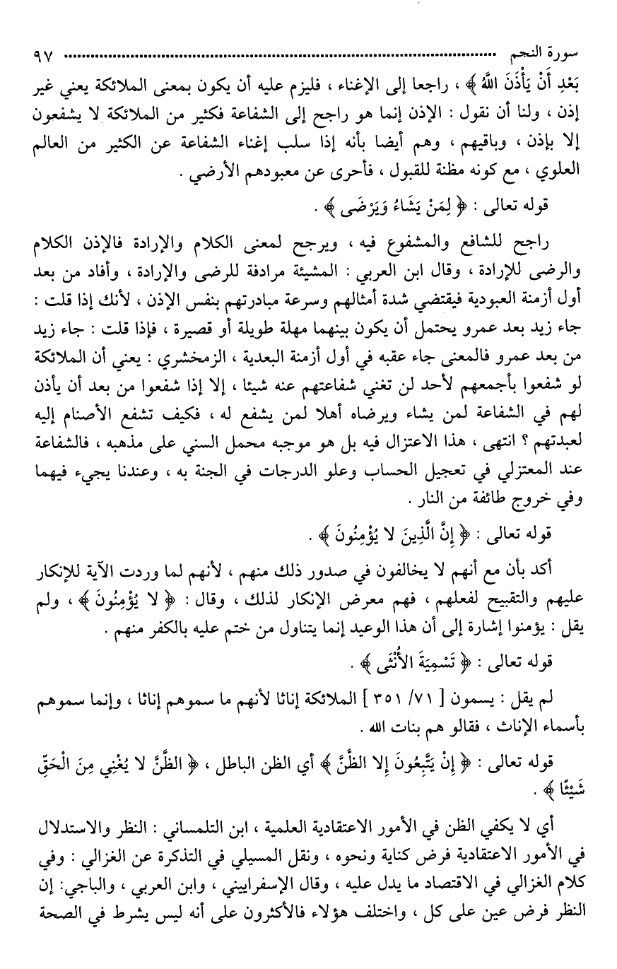 راجح للشافع والمشفوع فيه، [ويرجع*] لمعنى الكلام والإرادة، فالإذن الكلام والرضى للإرادة، وقال ابن العربي: المشيئة مرادفة للرضى والإرادة، وأفاد من بعد أول أزمنة العبودية فيقتضي شدة [امتثالهم*] وسرعة مبادرتهم بنفس الإذن، لأنك إذا قلت: جاء زيد بعد عمرو يحتمل أن يكون بينهما مهلة طويلة أو قصيرة، فإذا قلت: جاء زيد من بعد عمرو فالمعنى جاء عقبه في أول أزمنة البعدية، الزمخشري: يعني أن الملائكة لو شفعوا بأجمعهم لأحد لن تغني شفاعتهم عنه شيئا، إلا إذا شفعوا من بعد أن يأذن لهم في الشفاعة لمن يشاء ويرضاه أهلا لمن يشفع له، فكيف تشفع الأصنام إليه لعبدتهم؟ انتهى، هذا الاعتزال فيه؛ بل هو موجبه [حمل*] السني على مذهبه، فالشفاعة عند المعتزلي في تعجيل الحساب وعلو الدرجات في الجنة به، وعندنا يجيء فيهما وفي خروج طائفة من النار.