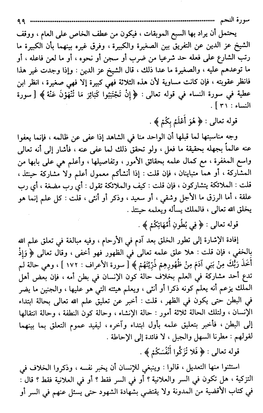إفادة الإشارة إلى تطور الخلق بعد آدم في الأرحام، وفيه مبالغة في تعلق علم الله بالخفي، فإن قلت: هلا علق علمه تعالى في الظهور فهو أخفى، وقال تعالى (وَإِذْ أَخَذَ رَبُّكَ مِنْ بَنِي آدَمَ مِنْ ظُهُورِهِمْ ذُرِّيَّتَهُمْ)، وهي حالة لم [يدَّعِ أحدٌ*] مشاركة في العلم؛ بخلاف حالة كون الإنسان في بطن أمه، فإن بعض أهل [العلم*] يزعم أنه يعلم كونه ذكرا أو أنثى، ويعلم هيئته التي هو عليها، والجنين [**ما يصير] في البطن حتى يكون في الظهر، قلت: أخبر عن تعليق علم الله تعالى بحالة ابتداء الإنسان، ولتلك الحالة ثلاثة أمور: حالة الإنشاء، وحالة كون النطفة، وحالة انتقالها إلى البطن، فأخبر بتعليق علمه بأول ابتداء وآخره، ليفيد عموم التعلق بما بينهما [كقولهم*]: مطرنا السهل والجبل، لَا فائدة إلى الإحاطة.