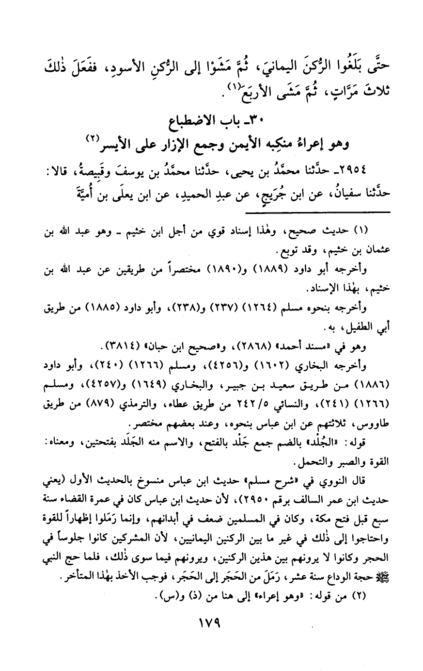 2954- حَدَّثَنَا مُحَمَّدُ بْنُ يَحْيَى ، حَدَّثَنَا مُحَمَّدُ بْنُ يُوسُفَ ، وَقَبِيصَةُ ، قَالاَ حَدَّثَنَا سُفْيَانُ ، عَنِ ابْنِ جُرَيْجٍ ، عَنْ عَبْدِ الْحَمِيدِ ، عَنِ ابْنِ يَعْلَى بْنِ أُمَيَّةَ ، عَنْ أَبِيهِ يَعْلَى أَنَّ النَّبِيَّ صَلَّى الله عَليْهِ وسَلَّمَ ، طَافَ مُضْطَبِعًا.